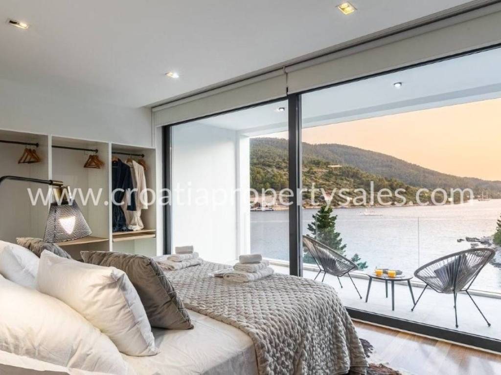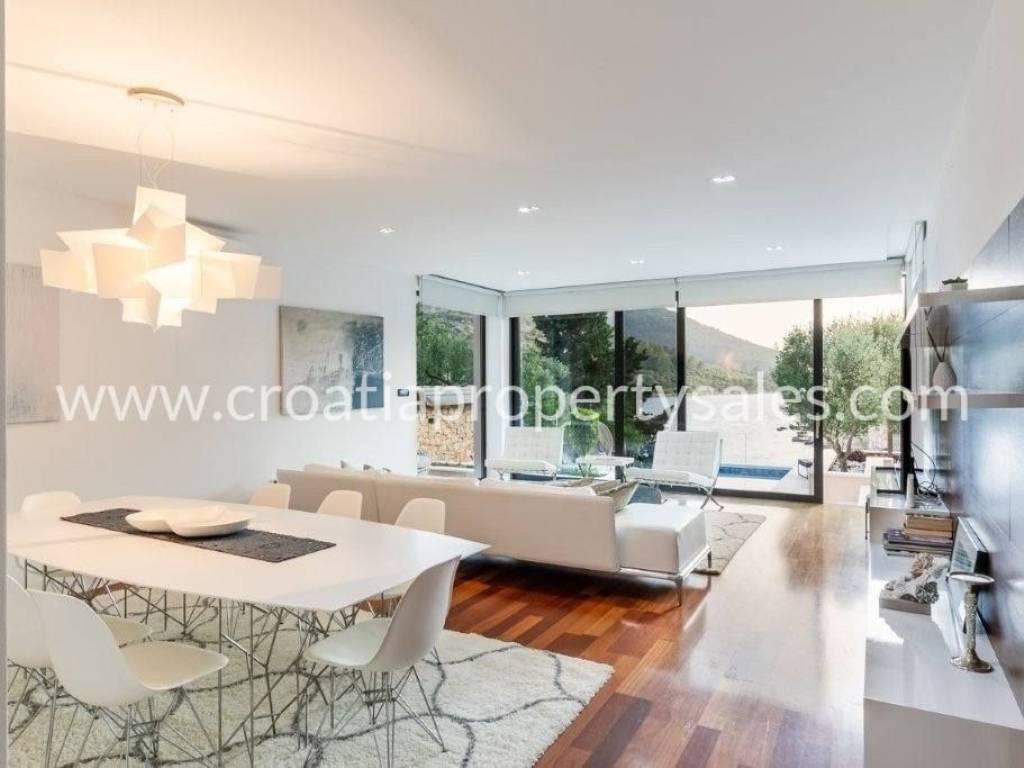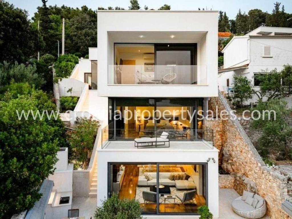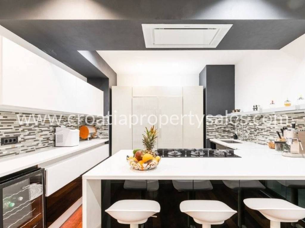 One of the most beautiful villas on the Adriatic, in the first row to the sea, south oriented in a beautiful location in a small bay bathed in the sun.Unique villa on three floors with a total area of 270 m2 has a total of 4 bedrooms, 5 bathrooms, kitchen with island and dining room, and a spacious living room.Each room has its own TV, but more importantly each room has a sea view, glass walls, lots of light and sun.It is being sold fully furnished, with designer furniture and chandeliers.It is built with the highest quality materials, with underfloor heating, and its luxury furniture fits perfectly into the interior.The living room opens onto a courtyard with a swimming pool and a garden with Mediterranean plants (olives, lemons, limes, oranges ...).In addition to the pool in the garden there is a barbecue grill, deck chairs and garden furniture for unforgettable summer dinners outdoors.The villa also has a small family cinema and attention was paid to every detail in terms of decoration and functionality.It takes only a 15-minute easy walk to the town center. Also, restaurants and cafes are nearby, yet far enough away that the villa provides perfect peace, rest and relaxation both by the pool and by the nearby beach just a few steps away.The villa has car access, and 4 cars can be parked on the 45 m2 parking lot.