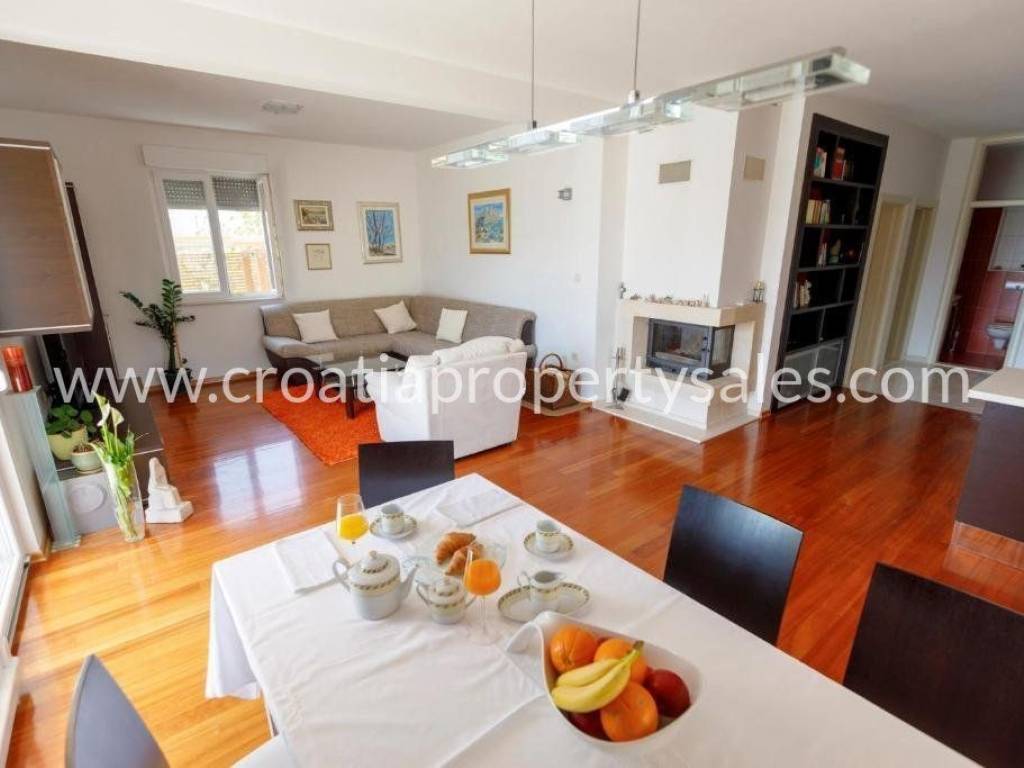 Villa in Kastela, south facing, with a wonderful view of the sea, located about 200 m above the main road on a plot of 1,140 m2.The living area is 338 m2, and consists of a basement, ground floor and first floor.In the basement there is a lounge area, a boiler room, two rooms, which serve as a storage, an area for entertainment and billiards, and a toilet.The basement can easily be made into a very comfortable two-room apartment if desired by the future owner.The ground floor consists of an entrance hall, a hallway, two bathrooms, two bedrooms, a kitchen with a pantry, a dining room and a large living room with direct access to the south-facing terrace, and a loggia, closed with a sliding wall, on the east side.The first floor of the house, which is connected by an internal staircase to the ground floor and the basement, has the same layout as the ground floor.It contains an entrance hall, hallway, two bedrooms, two bathrooms, kitchen, dining room and a large living room with two terraces.Each floor of the house has two air conditioners, and there are installations for underfloor heating in the bathrooms and kitchens, which is connected to the central heating.The 32 m2 outdoor pool has a heating and massage system.The garden and yard are beautifully and richly decorated.The villa has a table tennis court, mini football, children's playground, barbecue and a gazebo for relaxing in the shade.There is also a garage, and additional parking for at least eight cars, one part of which is covered.Only high-quality materials were used in the construction and furnishing. The villa is sold fully furnished.