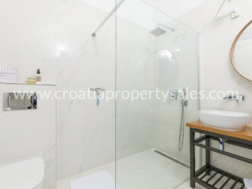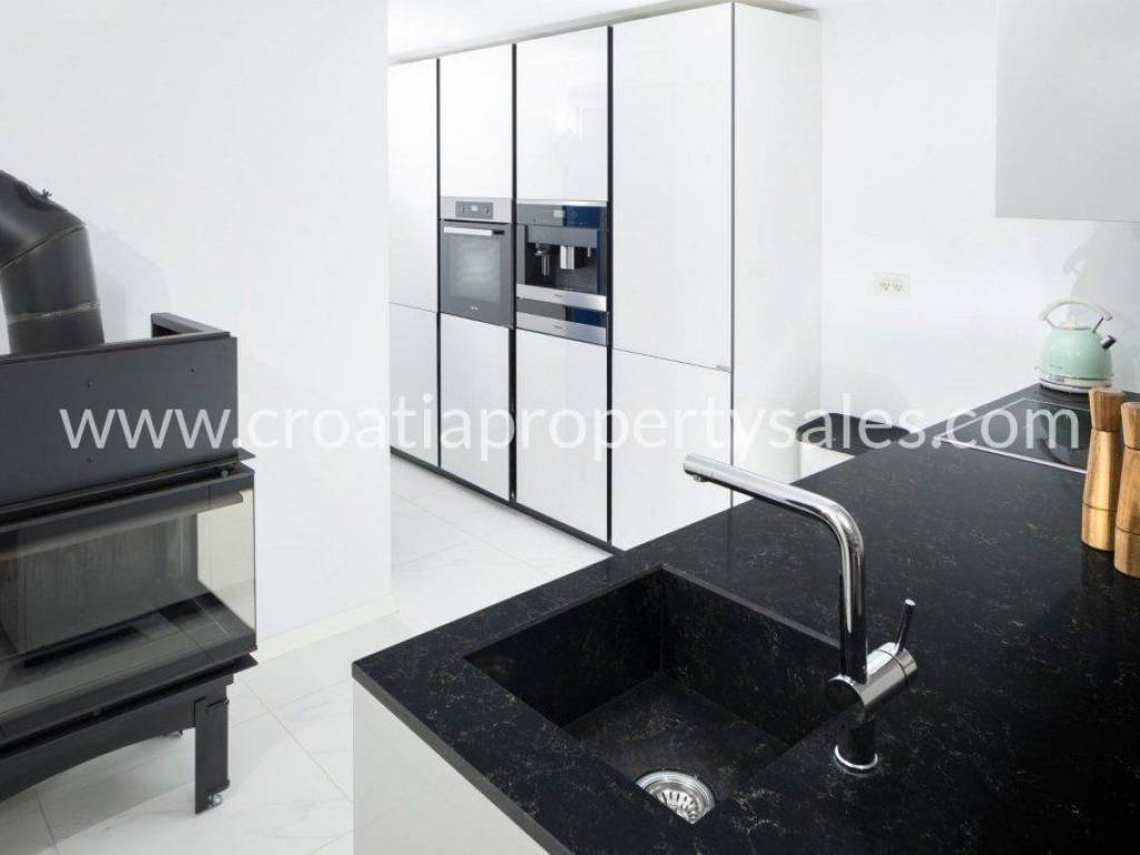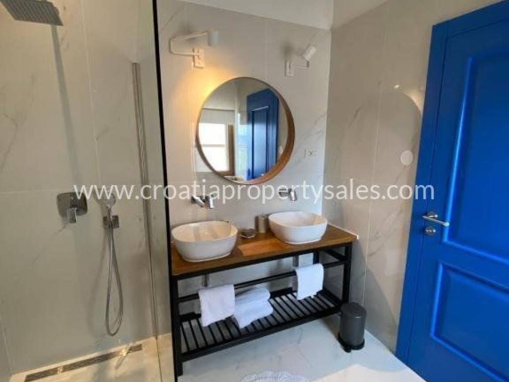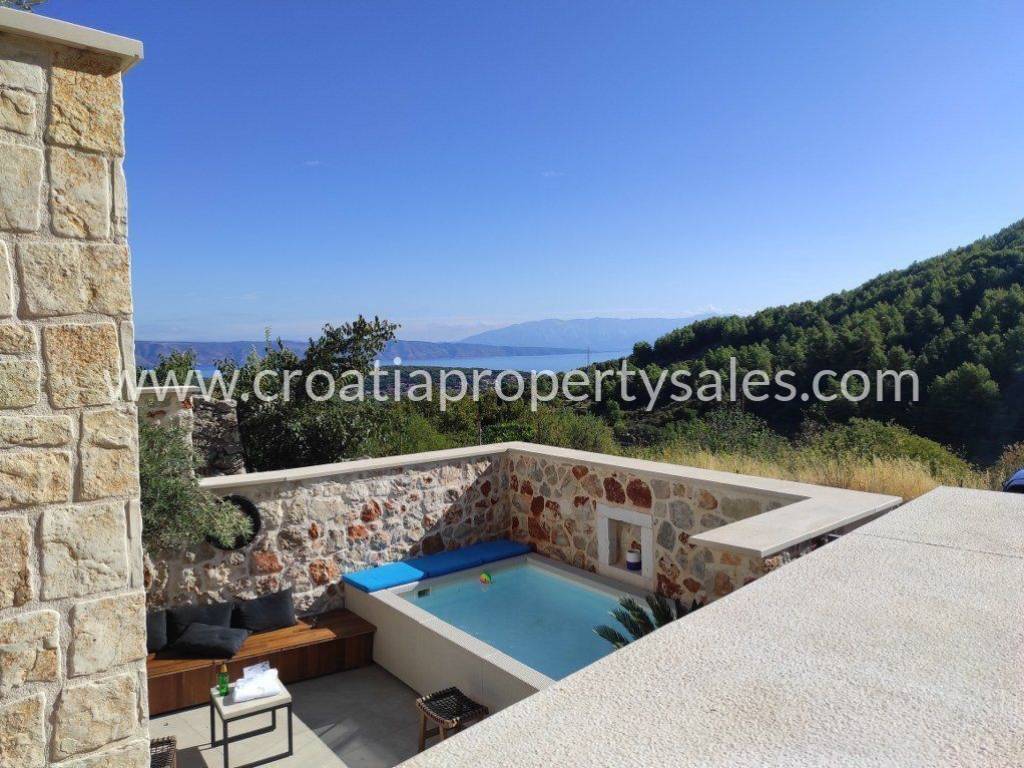 Newly built, stone-clad house in the most attractive village on Hvar.The house is surrounded by a stone wall, a swimming pool, a private parking place under the house, and an olive grove under the parking lot, and a view of the sea.The house consists of 3 floors.On the ground floor there is a living room, a sauna, one bathroom, one bedroom, a storage room.On the first floor there is one bathroom, kitchen, dining room and open-plan living room, exit to a terrace of approx. 20 m2 with a view of the hills and the sea.Internal stairs lead to the top floor, where there are two bedrooms, each with its own bathroom.The house is in excellent condition and has been categorized with 5 stars.It was built in 2018 and top-quality construction materials were used, as well as designer furniture in the decoration.Across the road there is a private parking lot and below it an olive grove of approx. 439 m2.