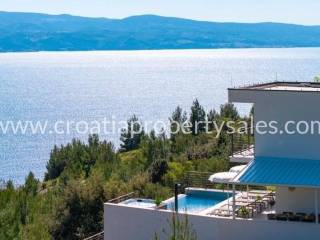 A wonderful, newly built villa with an open panoramic view that cannot be closed.We offer for sale a modern villa located in a small, quiet place on the Omis Riviera. The villa consists of a ground floor and 2 floors.On the ground floor of the villa there is an unfinished open space that can be used as a tavern or can be arranged as a space for playing and socializing.The ground floor also has an outdoor terrace.External stairs lead to the first floor of the villa where there is a bathroom, laundry room, kitchen, dining room and an open concept living room facing the southern terrace where there is a sundeck and swimming pool, and an outdoor kitchen.Stone-paved stairs lead to the second floor, where there are 3 bedrooms and two bathrooms, one of which is attached to the master bedroom.The house is sold without furniture, which allows the future owner to adapt the furniture to his wishes and taste.Four outdoor parking spaces are located on the north side of the villa, and garages can also be purchased upon request and upon agreement with the owner.