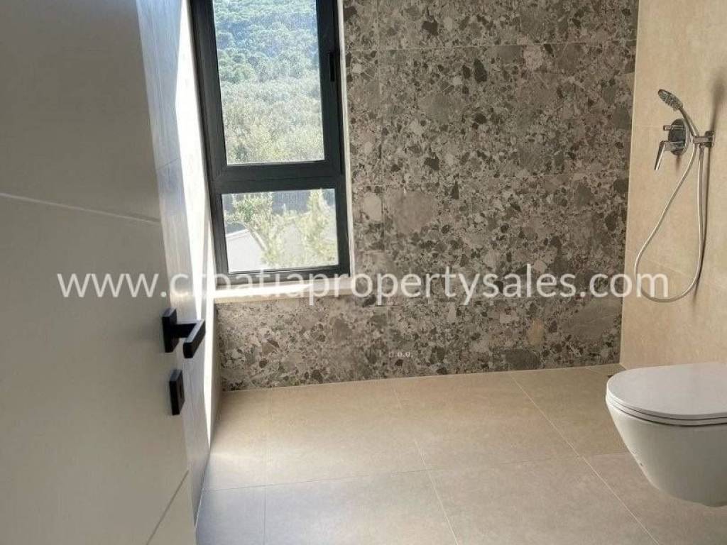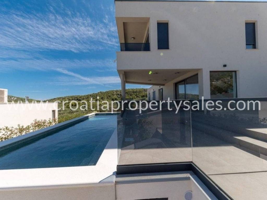 A modern, south facing villa with panoramic views of the open sea located on Betina island accessed by a bridge. Built with high-quality materials, it is located on a plot of land of 650 m2 and is spread over three floors: The basement consists of a large garage, space for laundry and storage. The ground floor consists of a hallway, toilet, entrance hall, bathroom, 2 bedrooms with access to the terrace, living room with kitchen and open plan dining room opening onto the terrace with a swimming pool. The first floor consists of a hallway, 2 large en-suite bedrooms, a wardrobe and terraces with beautiful views of the sea and the surrounding nature. A large supermarket is only 5 minutes away, while Betina village is 1.5km away. Šibenik and the Krka National Park are about 30 minutes away by car.