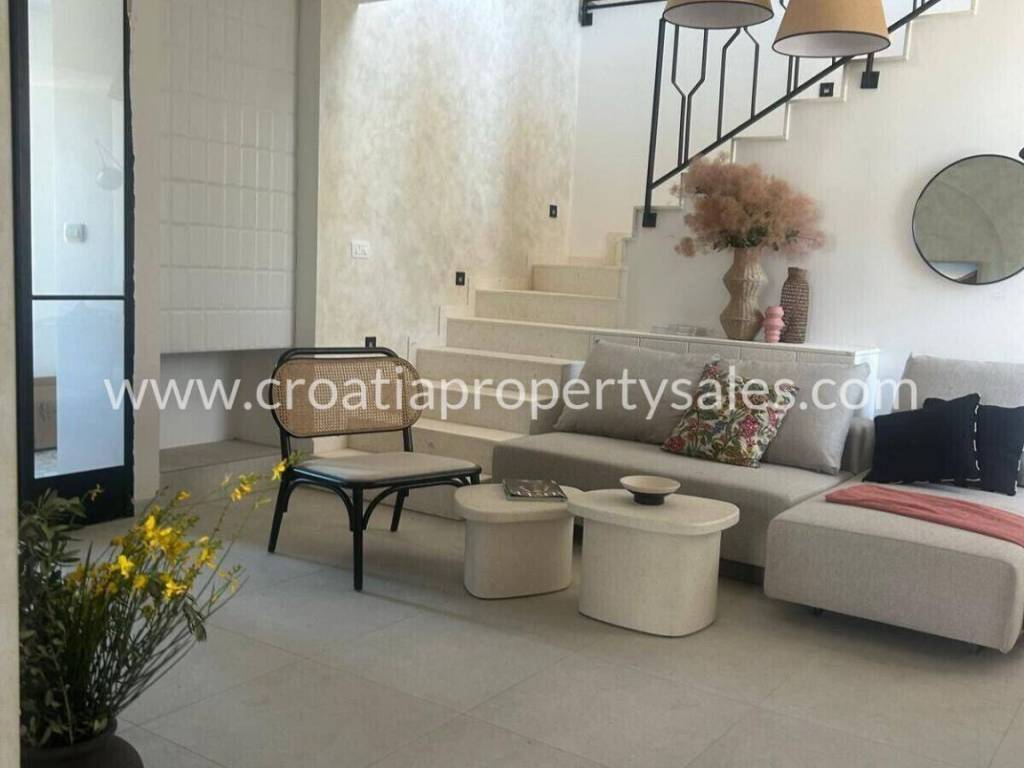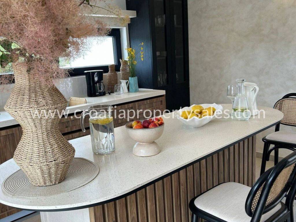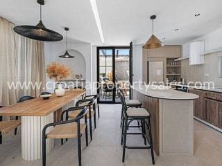 Newly built villa with a swimming pool in the first row to the sea in a quiet bay 10 minutes from Sibenik centre.It consists of two floors and a spacious garden. The ground floor has a kitchen, dining room, living room, storage/technical room, bathroom and one bedroom.On the first floor there are three bedrooms. An en-suite master bedroom with a walk-in wardrobe and private terrace, two further bedrooms share a common bathroom and each room has its own balcony.Outside there is a covered summer kitchen with a traditional built-in BBQ, swimming pool and covered parking area.There are six air conditioning units, floor heating and solar systems.The villa has excellent rental potential and is currently rented until the beginning of April so cannot be viewed inside during this time. (serious buyers please enquire). The villa was finished in June 2024. The price is fixed.