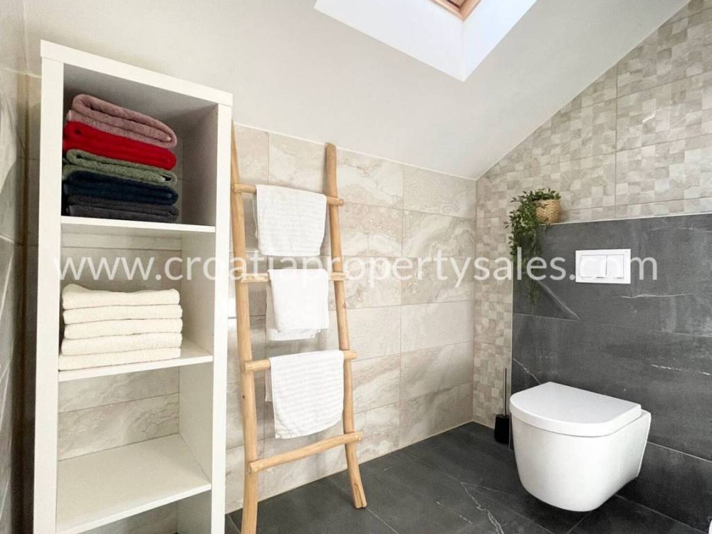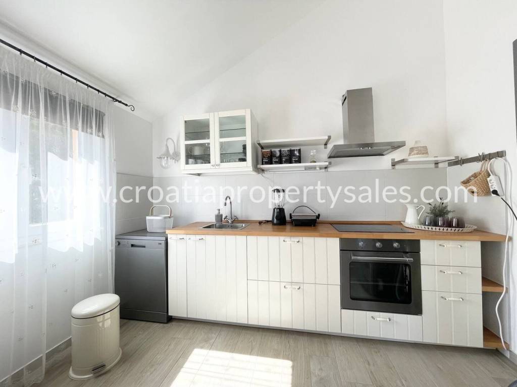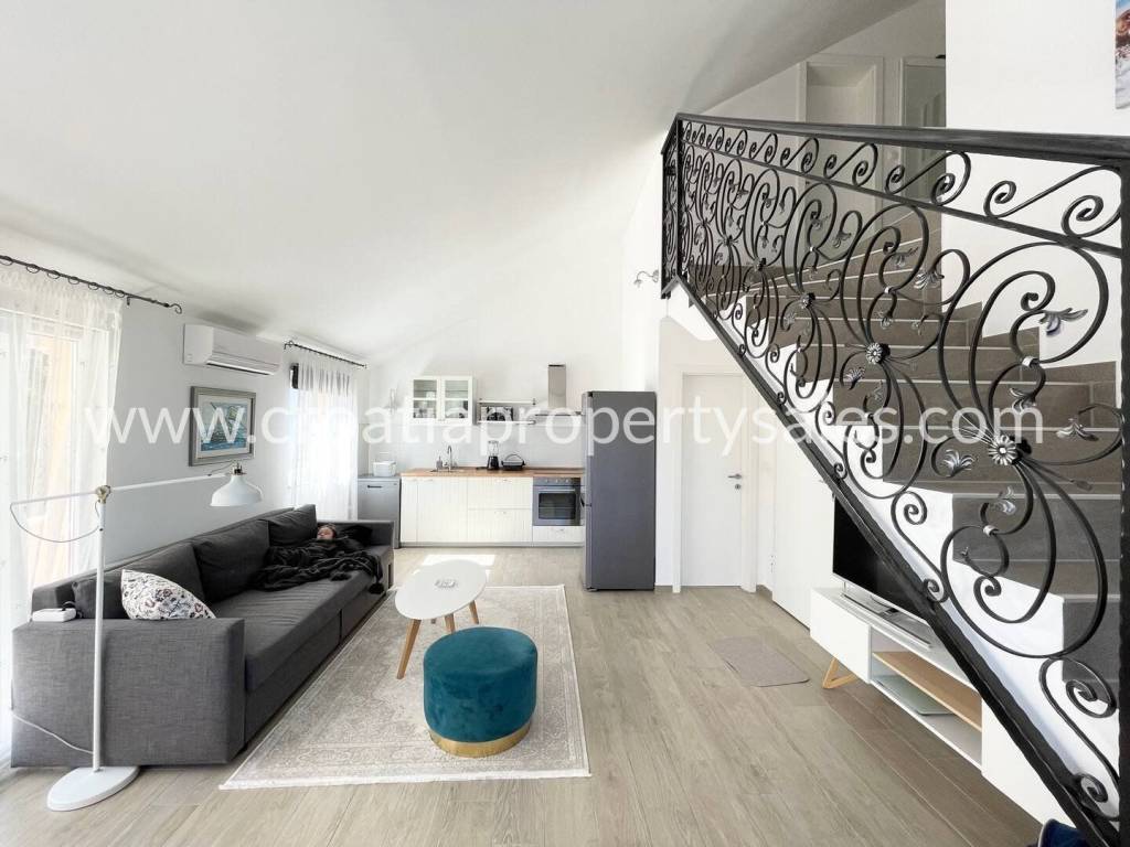 Duplex apartment with a sea view.It is located on the second floor of the house.It consists of a spacious living room with kitchen and dining room on the first floor and three bedrooms and two bathrooms on the second floor.The apartment has a spacious balcony on the west side with a beautiful view of the sunset.The apartment is very modern and luxuriously decorated, and it also has a parking space. It is only a 10-minute walk from the center of town and 5 minutes from a beautiful beach.It is ideal for living and for tourist rental, so it can be a great investment.