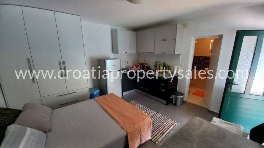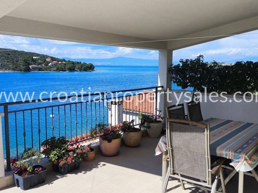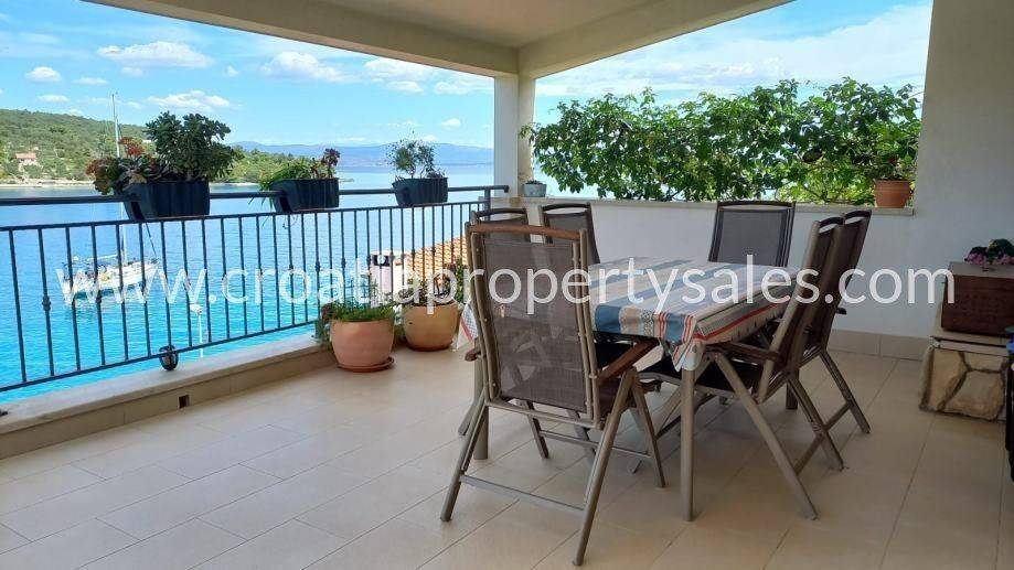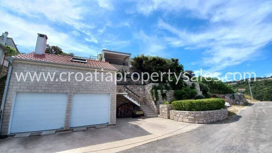 House in a quiet bay in the first row from the sea.The detached house was built on a plot of 611 m2, and consists of:- 115 m2 of internal surface- 43 m2 of terrace (of which 25 m2 covered with a concrete roof)- 3 rooms (10, 12 and 14 m2)- 2 bathrooms with toilet (12 and 9 m2)- engine room (Buderus wood-fired central heating of the highest quality, electric central heating, 800L water storage, boiler heated by a solar panel)Garage (35 m2) completely closed with Horman door with remote control. Two parking spaces in the garage and 1 outside.Above the garage there is a dining room with a kitchen, a large fireplace and a toilet. Suitable for social gatherings.Commercial attic with floor plan area of 115 m2 with a balcony of 8 m2 can be converted into residential. All installations are delivered. Openings for luminaires are provided on the roof.The lower studio apartment with a bathroom measures 20 m2. Air-conditioned. Next to it is a well that can be used to water the garden or to expand the studio apartment. 2 utility rooms (storage rooms) are located next to the building. There is an outdoor fireplace in front.The house is located first row to the sea in a quiet and safe neighborhood in the interior of the bay, separated from the center of the town.There are many green areas and gardens around the house, which makes it a very pleasant place to live, especially in summer. In excellent condition, renovated in 2015 and fully equipped, with a priceless view.