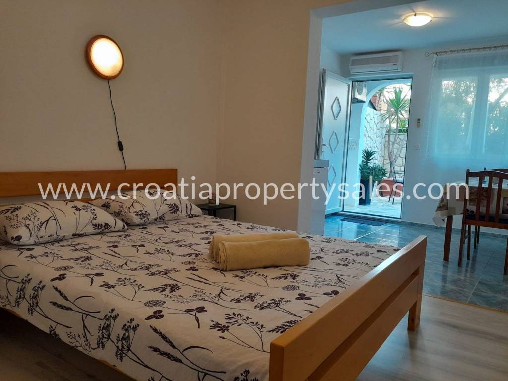 A beautiful family house in a quiet location with the possibility of building another floor, a ten-minute walk from the center.The house consists of a furnished ground floor of 147m2 and a newly built first floor that is currently in the final stages of decoration, with a total living area of 147m2, and an auxiliary building in the yard of 23m2.On the ground floor there is a one-bedroom apartment with access to a south-facing terrace and two apartments with access to the yard.On the first floor there is a spacious two-bedroom apartment with three terraces, the view from the south-facing terrace extends to the surroundings, and the sea and islands in the distance.
