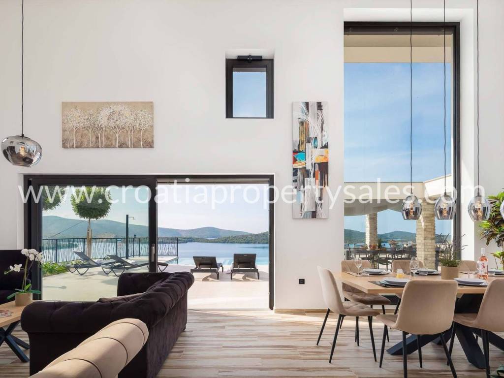 A luxuriously decorated villa near Šibenik with an infinity pool, tennis court and panoramic views over the archipelago. The building consists of 3 floors. The basement consists of a spacious games room, kitchen, pantry, dining area and living room combined into an open space totaling 32.64 m2, and a 12.87 m2 lounge. The basement leads to an uncovered terrace. The ground floor consists of a boiler/storage room, laundry room, sauna and wc.The first floor consists of four bedrooms, each measuring 18.89 m2 and 15.75 m2, each with its own bathroom.Additional amenities include a summer kitchen with a barbecue area, children's playground with a football/volleyball court with artificial grass measuring 162 m2, a 54 m2 pool and auxiliary building: a fully equipped 49.50 m2 apartment consisting of a kitchen and dining area for four people, a living room, a bedroom, and a bathroom. The total gross building area of the main house and auxiliary buildings is 360m2. Six parking spaces.The sale price includes additional plots: a building plot opposite the property covering 477 m2, suitable for construction, and an agricultural plot of 430 m2, also opposite the property.