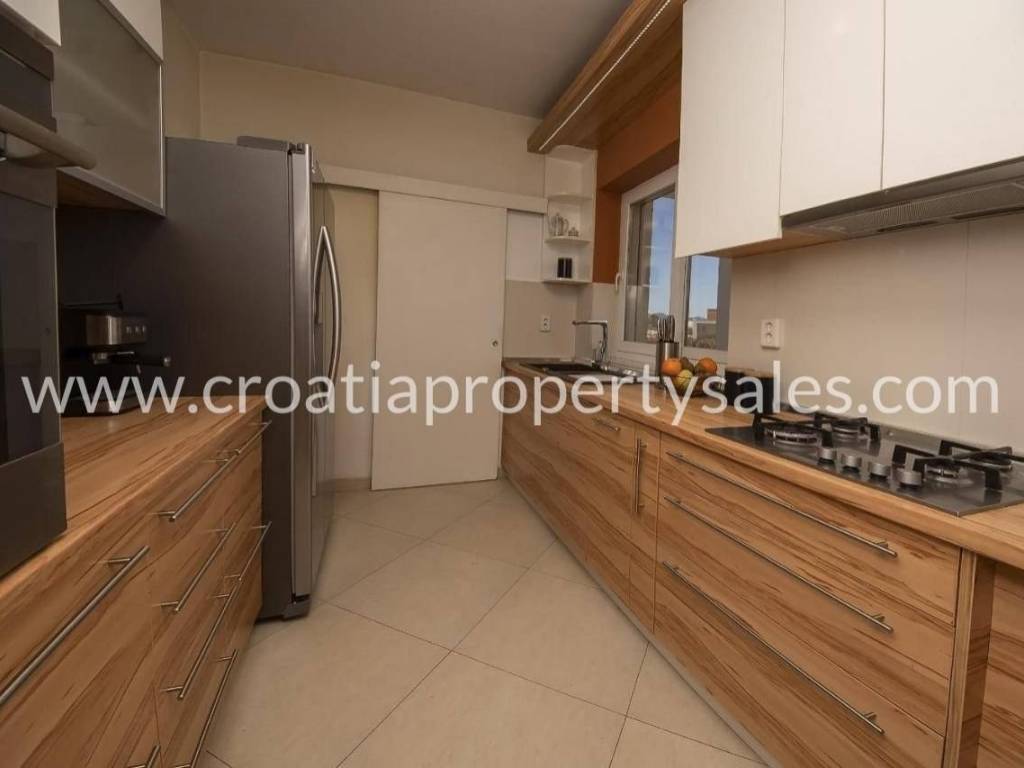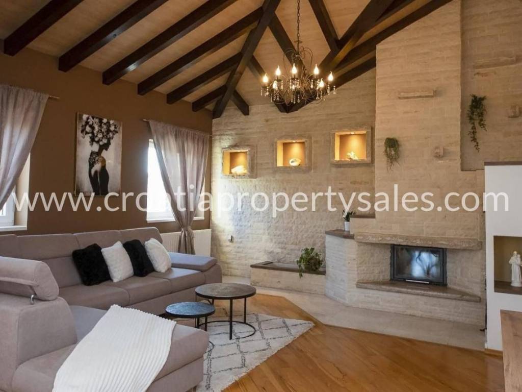 Beautiful modern yet traditional villa for sale in the vicinity of Sibenik in a peaceful location.The villa spreads over two floors. The ground floor consists of two semi-covered terraces, a games room that includes darts, billiards, a fireplace, a living room, dining room, kitchen, pantry, terrace, bathroom, WC, and one bedroom. The first floor consists of two bedrooms, a bathroom, laundry room, hallway, and terrace. It has central heating (wood and pellets), solar panels for water heating, air conditioning on both floors and underfloor heating on the ground floor.The property has a basement of 67 m2 and a garage of 40 m2.In the spacious garden, there is a swimming pool of 28 m2.