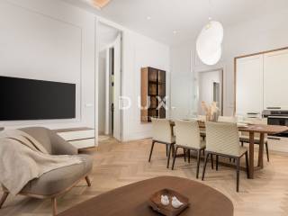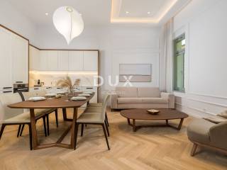 In the very center of Opatija, in a representative Austro-Hungarian building, there is this elegant and completely renovated property of 90 m2. Located on the 1st floor, the apartment consists of a spacious living room, a modern kitchen with a dining room, two bathrooms and a terrace. High ceilings, quality materials and plenty of natural light create a sophisticated yet comfortable atmosphere.