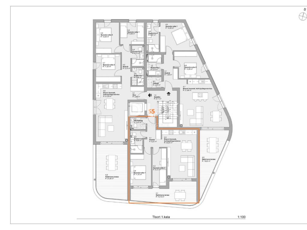 Apartment S5 is for sale on the first floor of a new building with a total of 9 residential units. The building has an elevator and from the first and second floor there is a beautiful view of the sea.
