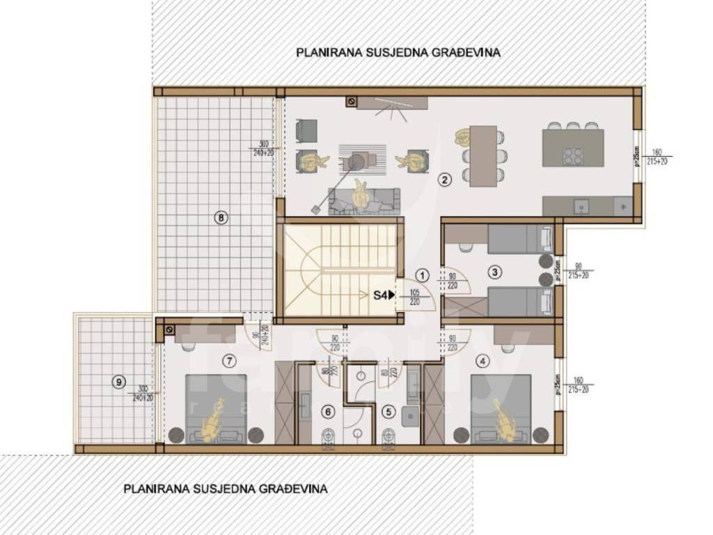 Apartment S4 Z4 with a total area of 120.78 m2 is located on the second floor of a residential building and stands out for its excellent layout. It consists of a spacious living room connected to the dining room, a kitchen functionally integrated into the living area, 3 bedrooms, 2 modern bathrooms and a hallway with enough storage space. A special advantage of this property is the covered terrace of 8.03 m2 and a large loggia of 22.07 m2, which provides additional outdoor space suitable for daily use and spending time outdoors with family and friends - a rarity that significantly increases the quality of living.