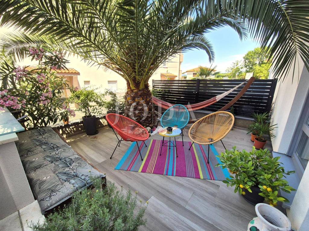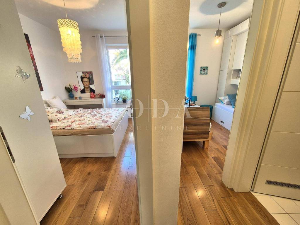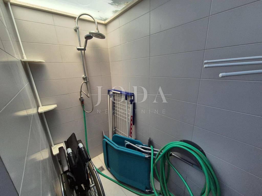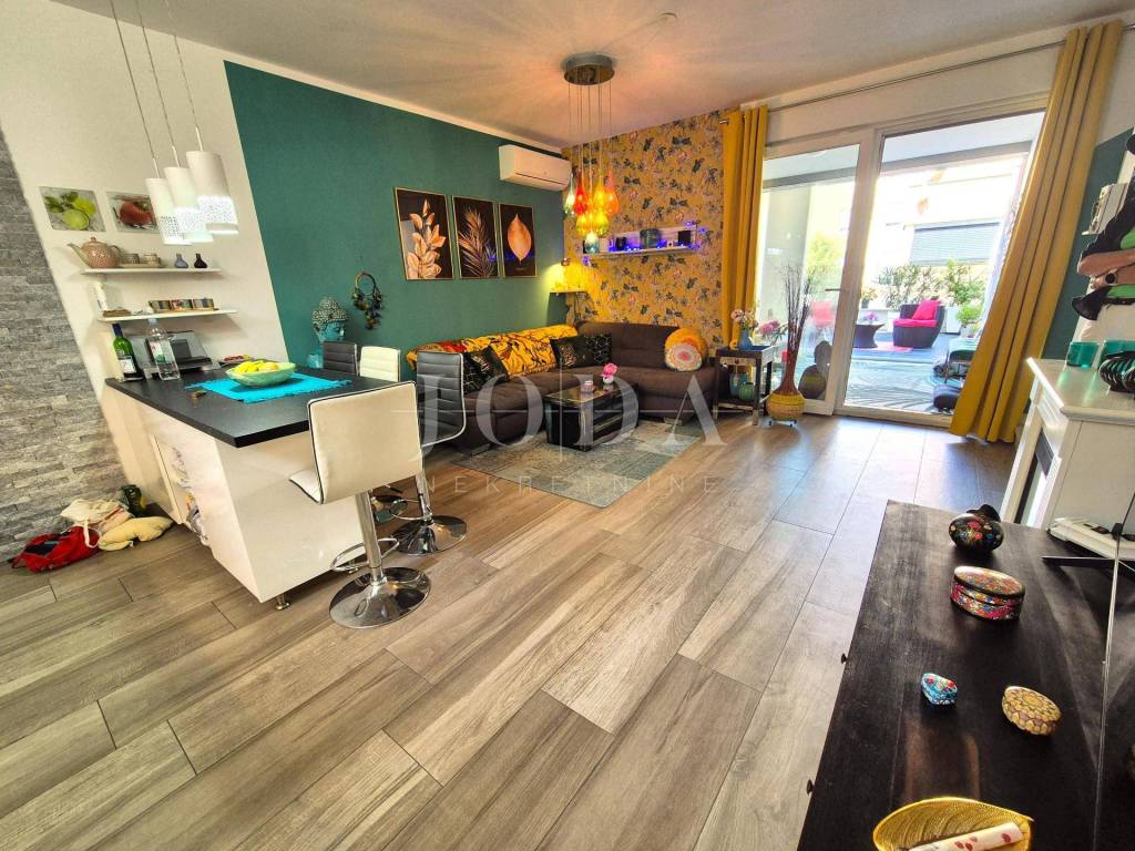 The apartment is located on the ground floor and spreads over 66.15 m2. It consists of a living room with a kitchen, a hallway, a storage room, a bathroom, two bedrooms and a loggia. It has a separate external entrance, PVC carpentry with blinds, two air conditioners and underfloor heating in the living room. The apartment has a landscaped garden area of 47 m2 and one parking space. It is fully equipped and furnished and is being sold as such. It is located in an excellent part of Njivice, only 150 meters from the beach and the sea!