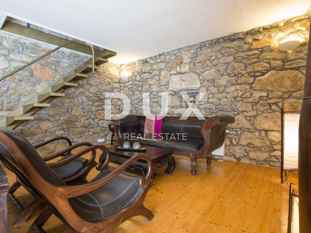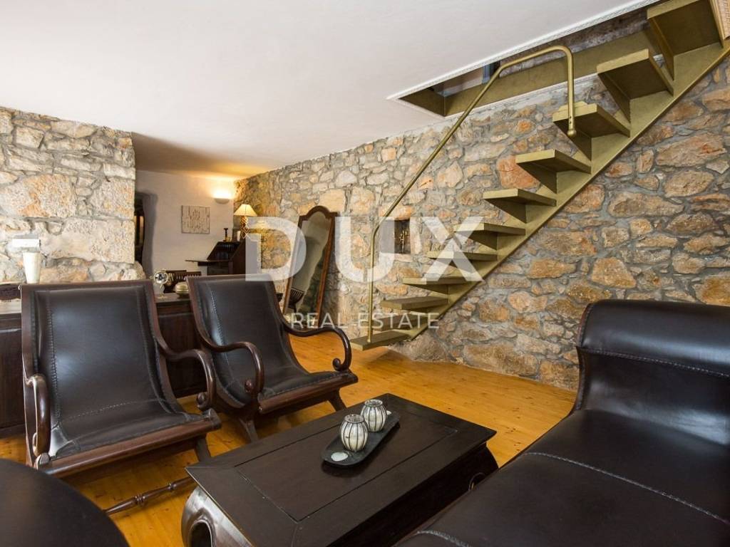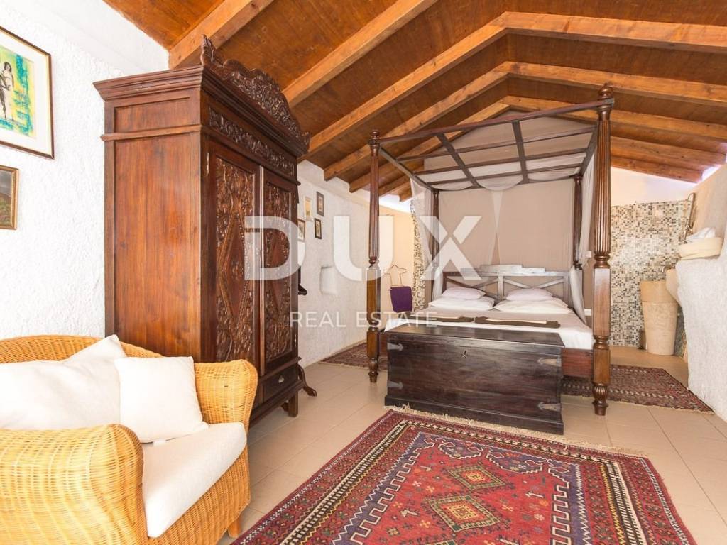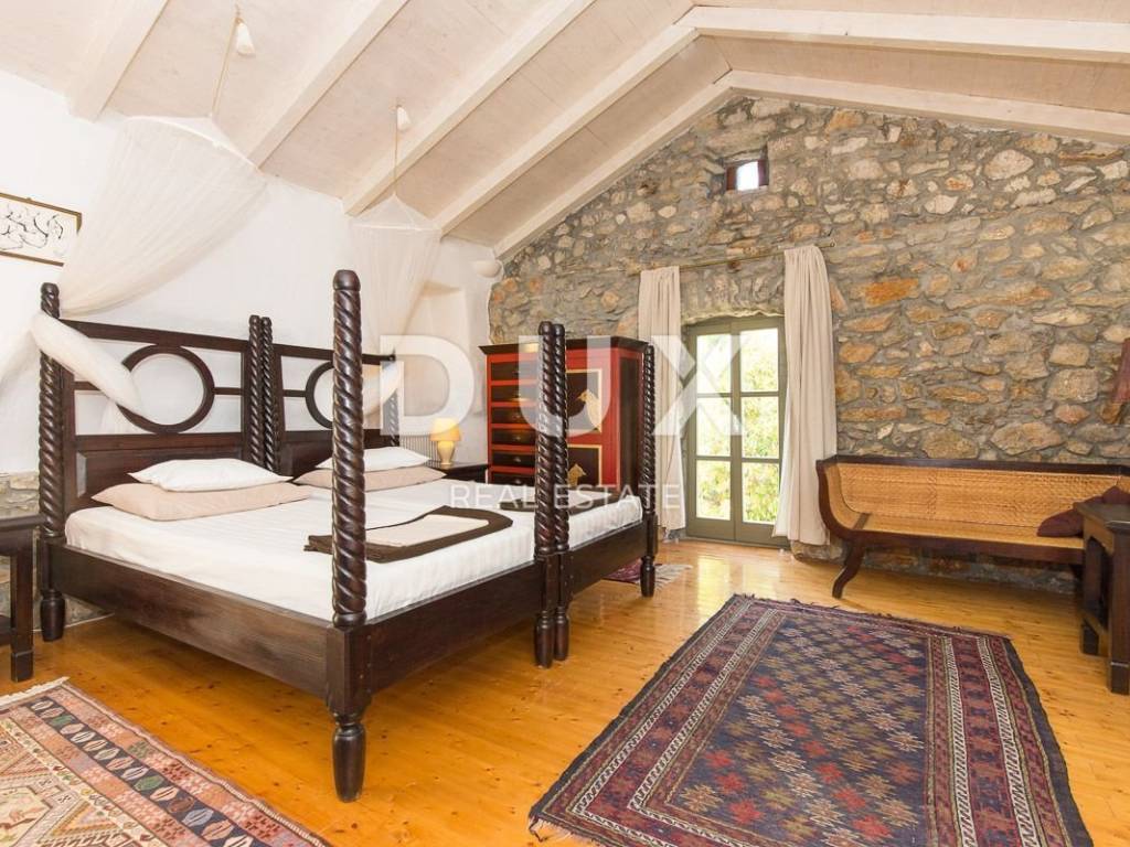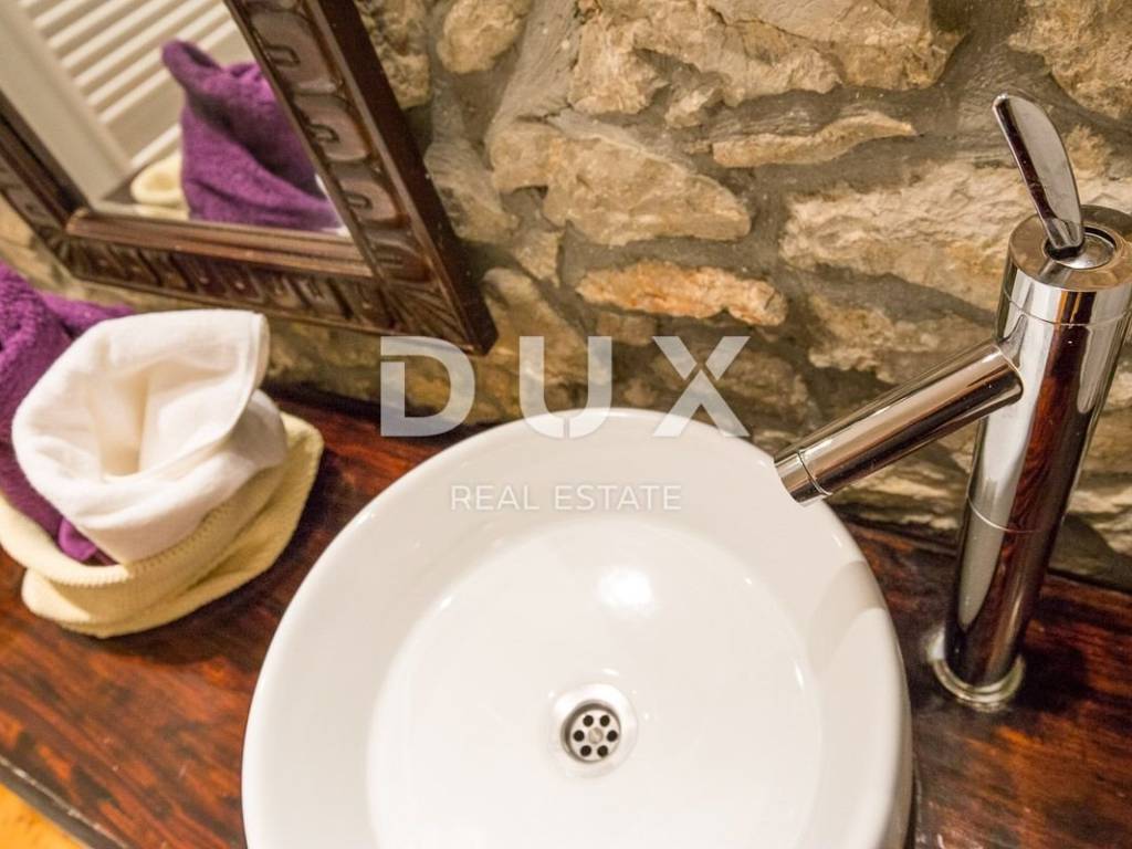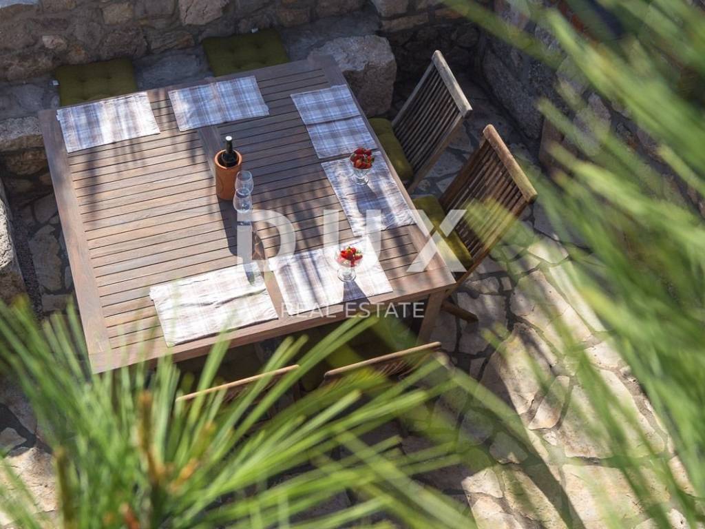 The larger stone house has an area of 160 m2 and extends over two floors - the ground floor, with a living area and kitchen and a guest toilet, and the first floor, connected by an internal staircase with two spacious bedrooms and two bathrooms, with access to a terrace overlooking the sea. Also, in the basement there is a 20 m2 tavern, with a beautiful indigenous vault. This house also has a smaller bungalow of about 30 m2, which functions as a bedroom with a bathroom.