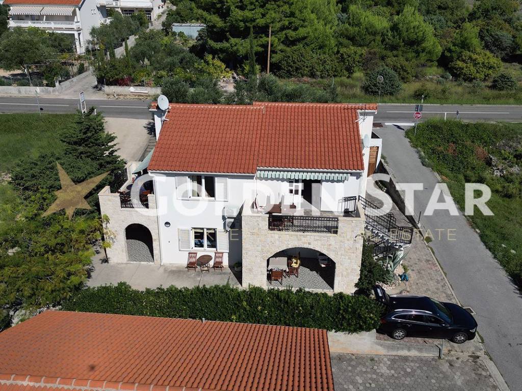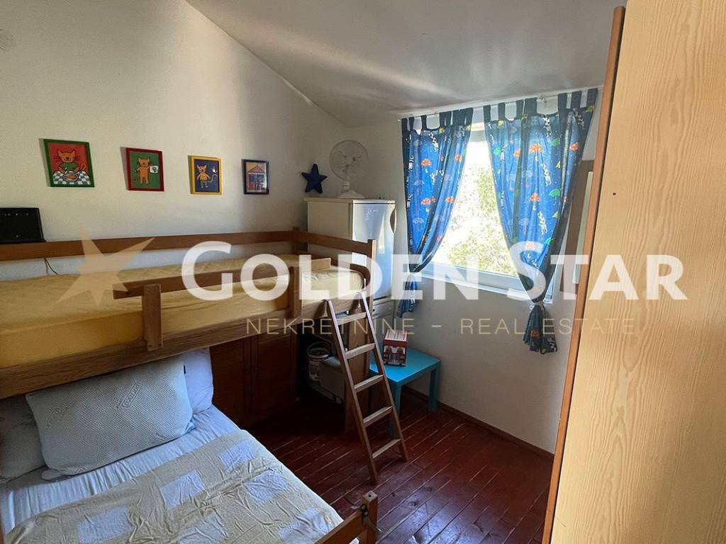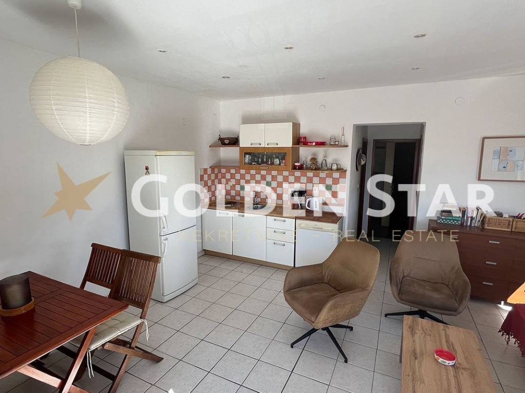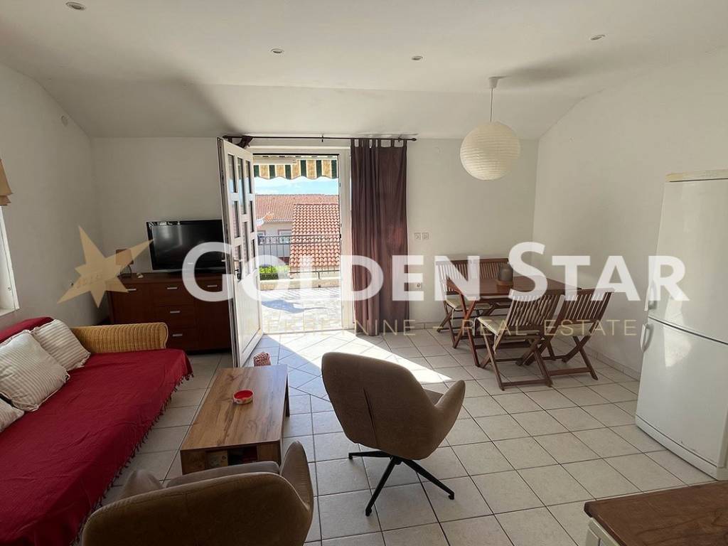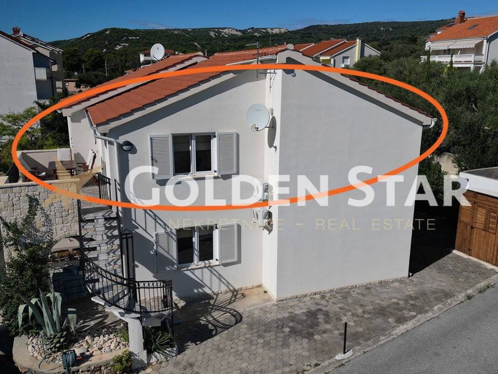 The apartment is located on the 1st floor. It consists of the following spaces: external staircase, uncovered terrace, kitchen with dining room and living room, hallway, bathroom and two bedrooms. The apartment has 2 parking spaces.