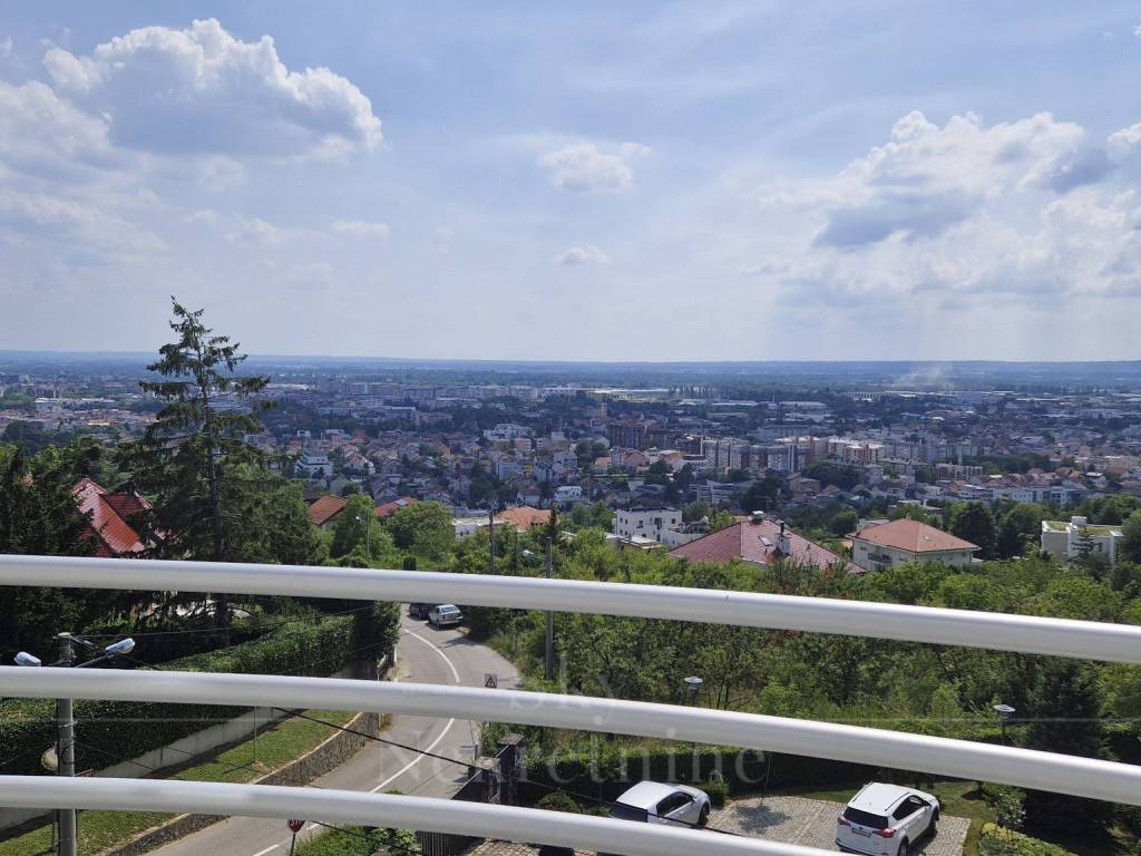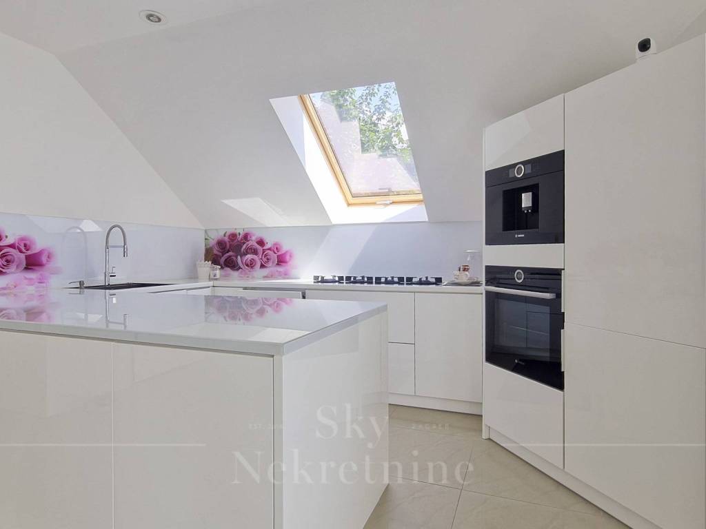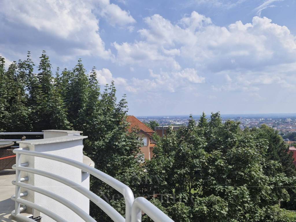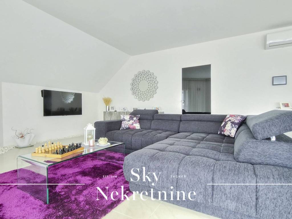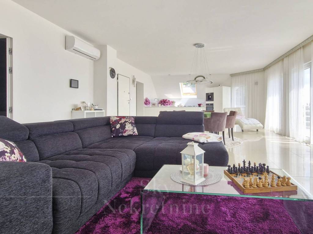 The apartment is located on the 3rd floor of a building constructed in 2000. It has an area of 130.15 m and consists of an entrance hall, open-space living room, kitchen and dining area, master bedroom with en-suite bathroom, children's bedroom, bathroom, and two balconies with panoramic views of Zagreb.