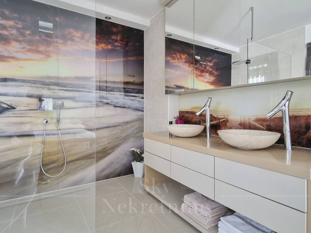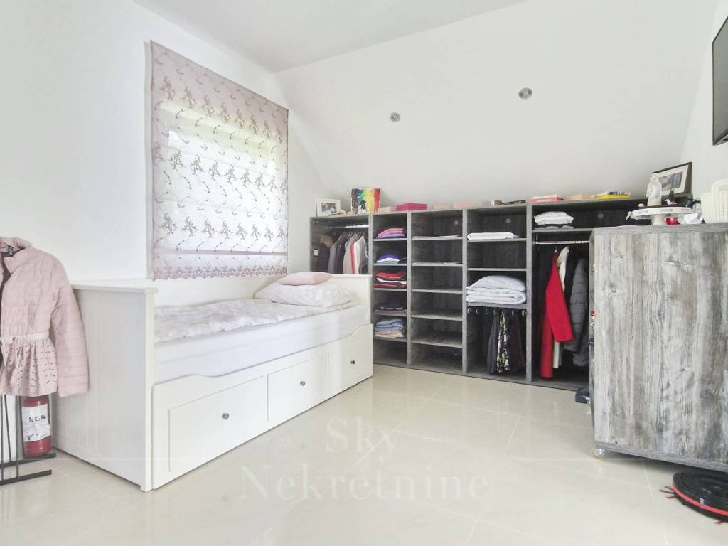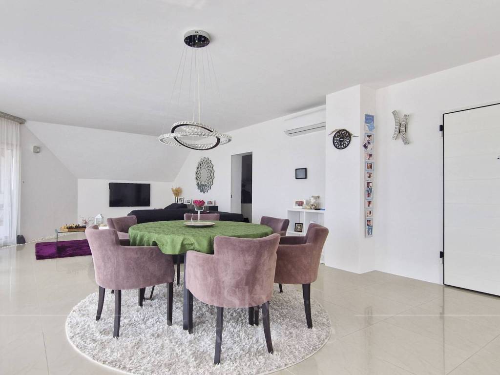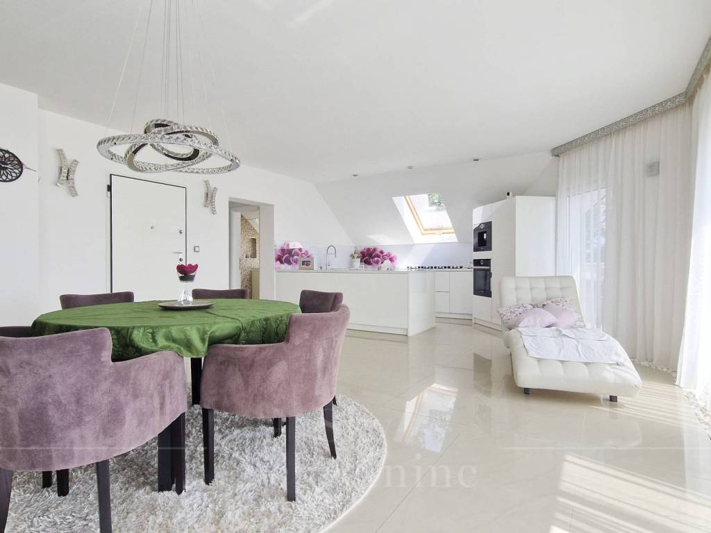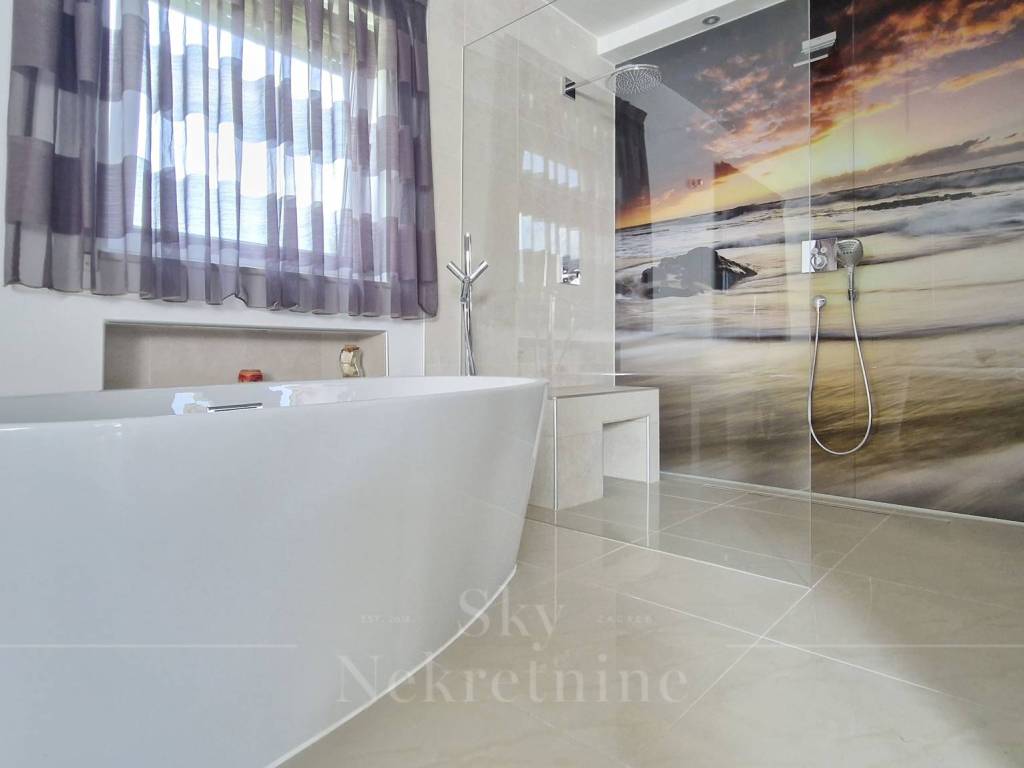 The apartment is located on the 3rd floor of a building constructed in 2000. It has an area of 130.15 m and consists of an entrance hall, open-space living room, kitchen and dining area, master bedroom with en-suite bathroom, children's bedroom, bathroom, and two balconies with panoramic views of Zagreb.