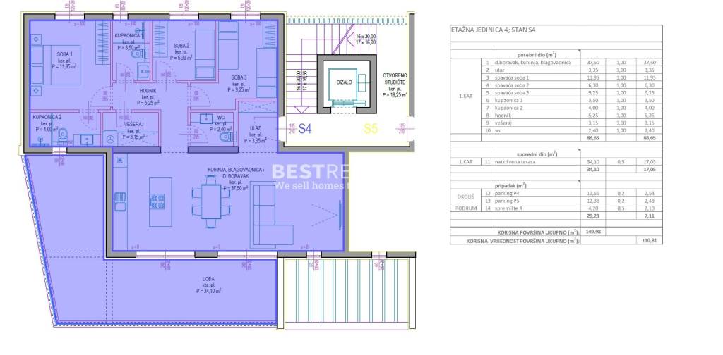 Stan se nalazi na prvom katu i odmah je useljiv. Sastoji se od tri prostrane spavaće sobe, dvije kupaonice, dodatnog WC-a, vešeraja te prostrane kuhinje s blagovaonicom i dnevnim boravkom. Iz dnevnog prostora izlazi se na veliku natkrivenu terasu – savršenu za opuštanje i druženje na svježem zraku.