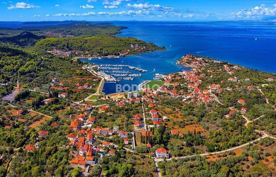 This building plot of 1241 m2 is located in a beautiful and quiet area of Sutomišćica, surrounded by olive groves, untouched nature and only a few family houses in the neighborhood. It is positioned on an elevated area, so the plot offers a beautiful view of the sea towards Zadar, the surrounding area and Velebit. The location where the plot is located is connected to both the center of Sutomišćica and the town of Poljana. The width along the road is approximately 30 m, and the special feature of this plot is that it also has an access road on the opposite side, which allows for more diverse design and construction. The plot is approximately 200 m from the sea and the beach. For this building plot it has been issued a final building permit for a residential building with two residential units, each with a swimming pool.