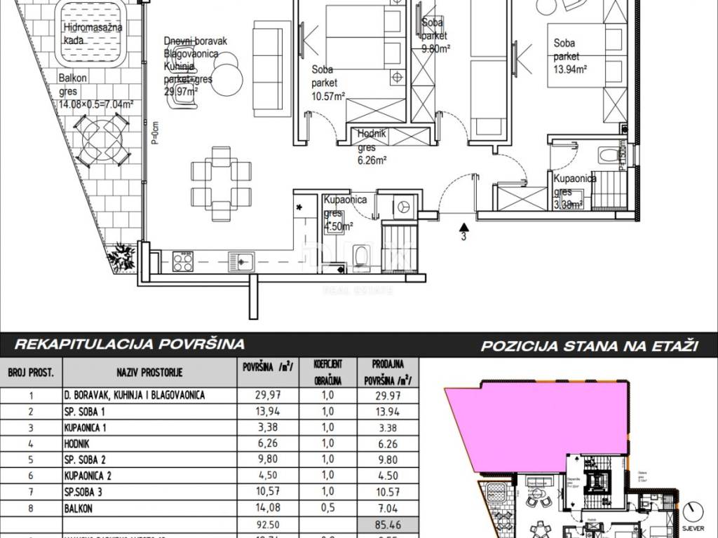 A luxury apartment under construction is for sale located in an exclusive location by the sea in Sukošan near Zadar. The apartment is located in a smaller residential building with six units in a luxury new building complex. The apartment with a total living area of 88.01 m2 is located on the first floor and consists of a living room, kitchen and dining room, three bedrooms, two bathrooms, a balcony and one parking space. The total usable area of the apartment together with all accessories is 105 m2. On the ground floor there is a shared swimming pool for all tenants. Garage space and storage room in the basement of the building for an additional fee.