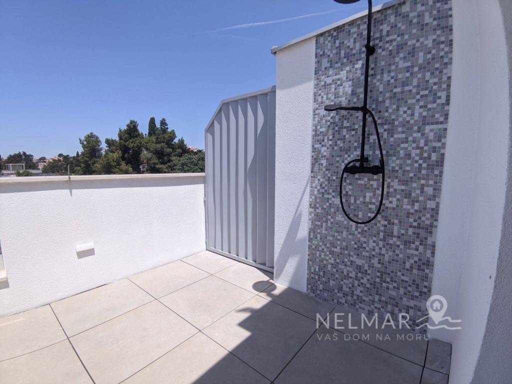 The modern penthouse marked S3 is located on the second floor and covers an area of 88.18 m2, and consists of an entrance hall and hallway, which separates the living area from the sleeping area of the apartment. The sleeping part of the apartment consists of two bedrooms that share a bathroom and a master bedroom with en suite bathroom. The rooms are decorated with long French windows that give light and airiness to the whole space. The living part of the apartment consists of a guest toilet, laundry, kitchen, dining room and living room in a spacious "open space" version. A large full-length glass wall connects the interior with a large covered terrace. The stairs lead to the part where there is a sauna with a window overlooking the sea and an exit to the roof terrace where a large jacuzzi 6 meters long with an unobstructed view of the Zadar archipelago. In the corner of the roof terrace there is a modern outdoor shower, which is decorated with mother-of-pearl mosaic.