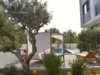 A modernly designed and luxuriously equipped villa with a pool is for sale, located in a peaceful environment, ideal for family life or as an investment in tourist rental.   The villa has 230 m² of living space and is located on a plot of land of 533 m². It is spread over two floors and has three bedrooms, two bathrooms and an additional toilet. The distance from the sea is approximately 1.3 km. Architecturally, it stands out with a cantilevered balcony with wooden elements in the lower view, which contributes to the modern and elegant appearance of the property. Large glass surfaces provide plenty of natural light and emphasize the contemporary interior design.   The landscaped garden includes a heated pool of 26 m², a spacious terrace and a fully equipped outdoor kitchen with barbecue (fireplace), toilet and all necessary kitchen appliances, ideal for socializing and spending time outdoors.   The villa is equipped with: – underfloor heating in the bedrooms and living room – air conditioning in all rooms, including the garage – TV-satellite system – smart entry system and intercom   The kitchen is equipped with Bosch appliances (Series 6), while the laundry room has a washing machine and dryer. High-quality FEAL aluminum joinery with a lifting system and a thermal insulation facade (8 cm polystyrene) have been installed.   The villa has a garage, 5 outdoor parking spaces and an additional 2 covered spaces. An electric scooter is also included in the price, as an additional convenience for daily mobility. The entire plot is fully fenced, with controlled access through the gate and main door, which ensures a high level of privacy and security. A special advantage of the property is the 10 kWh solar power plant with a Huawei inverter, which contributes to energy efficiency and cost reduction.   According to the results so far, the villa generates an annual income of approximately €50,000, making this property an attractive investment opportunity with already established income potential. Only high-quality materials were used during construction, and the villa has been carefully designed to meet high standards of comfort, luxury and a modern lifestyle.