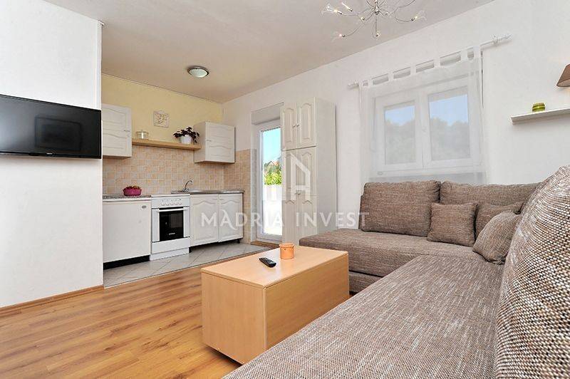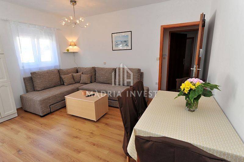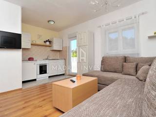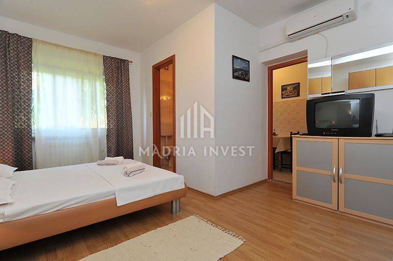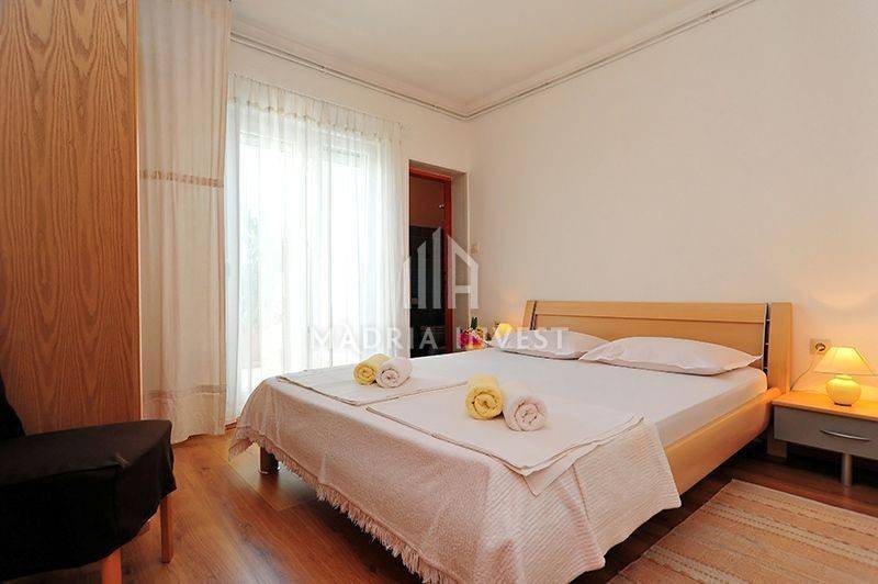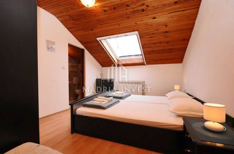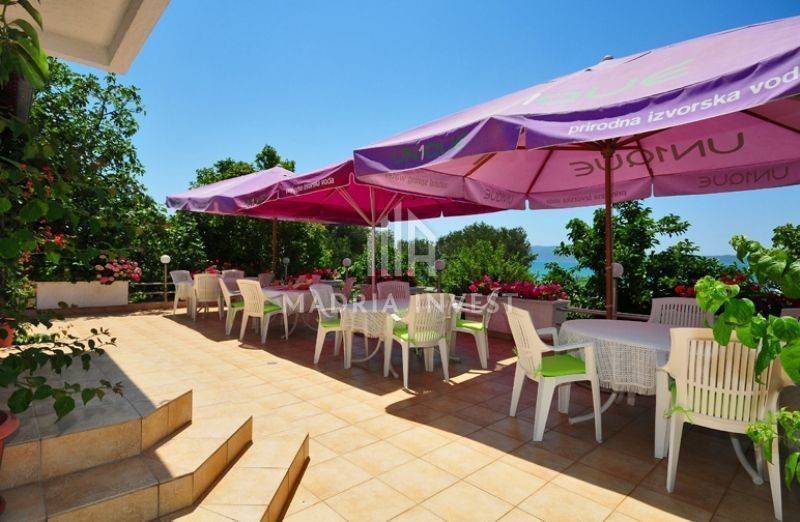 Attractive apartment complex with several studio apartments and rooms with bathrooms. Every floor offers a view of the sea. It is sold fully furnished. On the ground floor of the building there is a large hall with max. 150 seats, which is connected to a large terrace with approx. 50 seats, bar, storeroom, sanitary facilities (4 toilets), large catering kitchen with complete equipment, refrigerator and storerooms. There is also 1 double room with a bathroom on the ground floor. Floor: 3 double rooms with bathroom, 1 studio apartment, 3 apartments for 2+2 people with terraces. Attic: large terrace with sea view, 6 double bedrooms, 3 bathrooms, large living room with dining room and kitchen. In the yard behind the house there are two garages, a workshop, a laundry room, a storage room, utility rooms, a fireplace-grill. In the basement there is a large space for wine, heating and storage. The entrance and courtyard are lined with stone floor slabs, covered with kiwi and vines, the garden is decorated with lots of flowers and greenery. The house also has its own beach with a mule and moorings for boats, a large cistern-gas tank with a capacity of approx. 50,000 L, solar water heating, central heating with electricity and fuel, generator for electricity for the whole house.