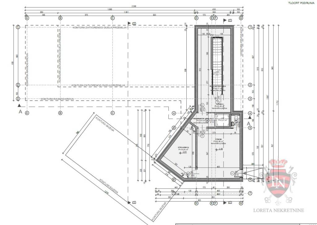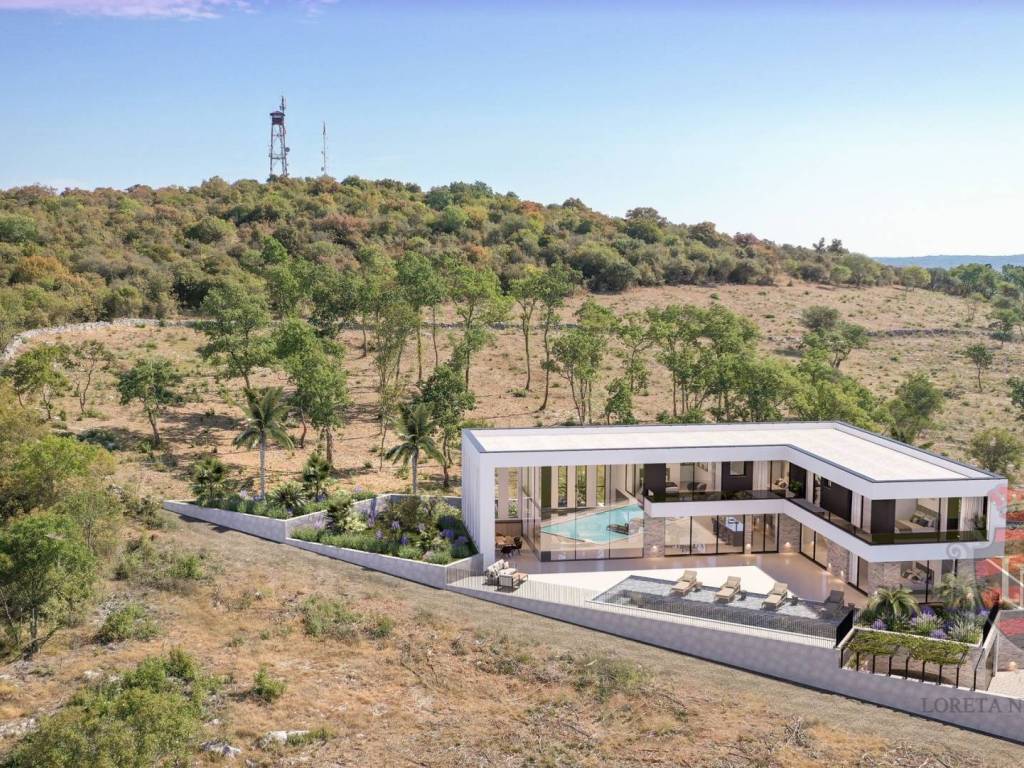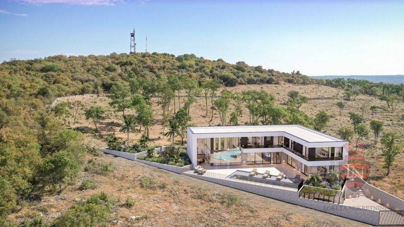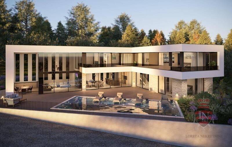 Land for sale in Bale , Istria . Land of 834 m2 with a project of 445 m2 and a building permit . The construction site is already open and a beautiful villa with a swimming pool is being built . The connections are all paid for and brought to the land . The newly planned individual residential building – a family house with one residential unit , will have a floor plan of an irregular rectangular shape . The building will have a basement , ground floor and first floor . The newly planned main building is of a residential type , with one residential unit and an outdoor swimming pool , and the auxiliary building is planned as a garage . The distribution of installations with associated devices in the area of coverage includes : • installation of water supply ( water tank ) • wastewater drainage ( watertight collection pit ) • gas and mechanical installations ( heat pumps ) • Electrical installations of high and low current. The use of natural gas as an energy source is not envisaged in the newly planned building . Vertical communication is planned by a staircase and an elevator .