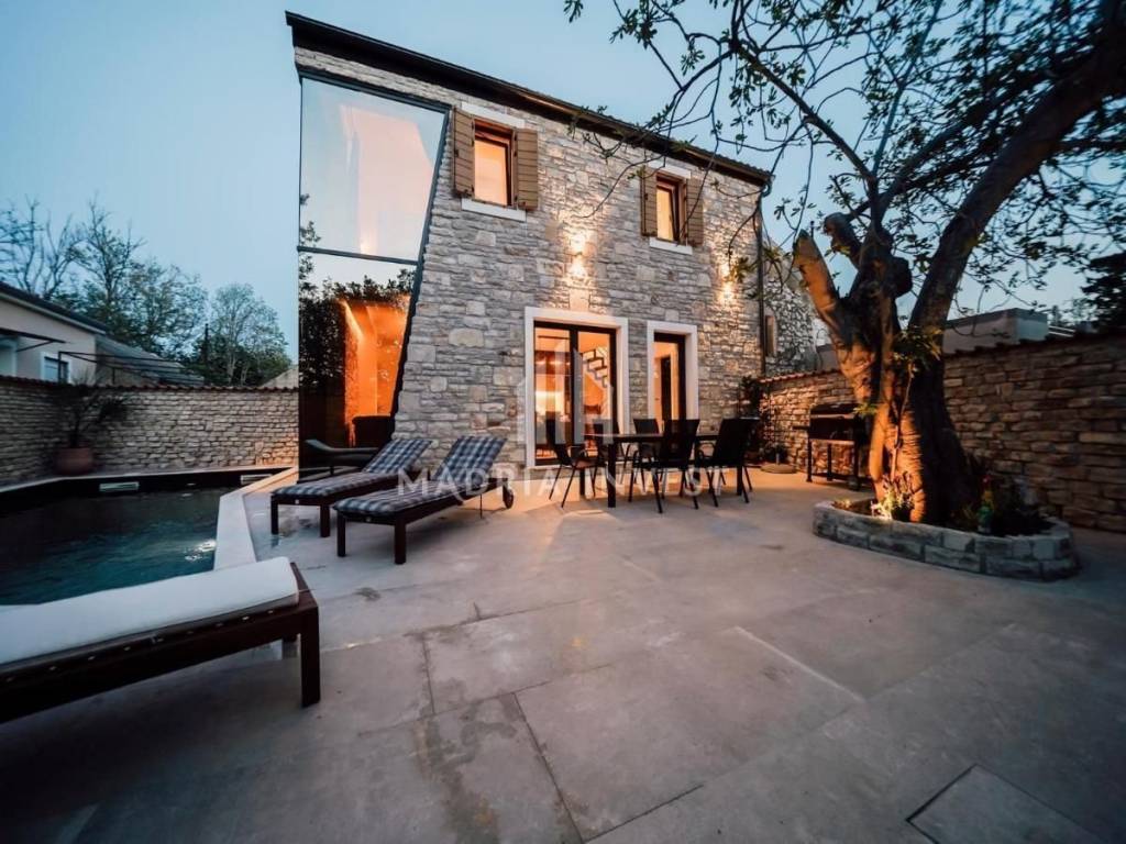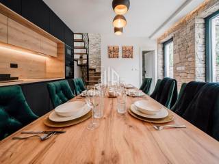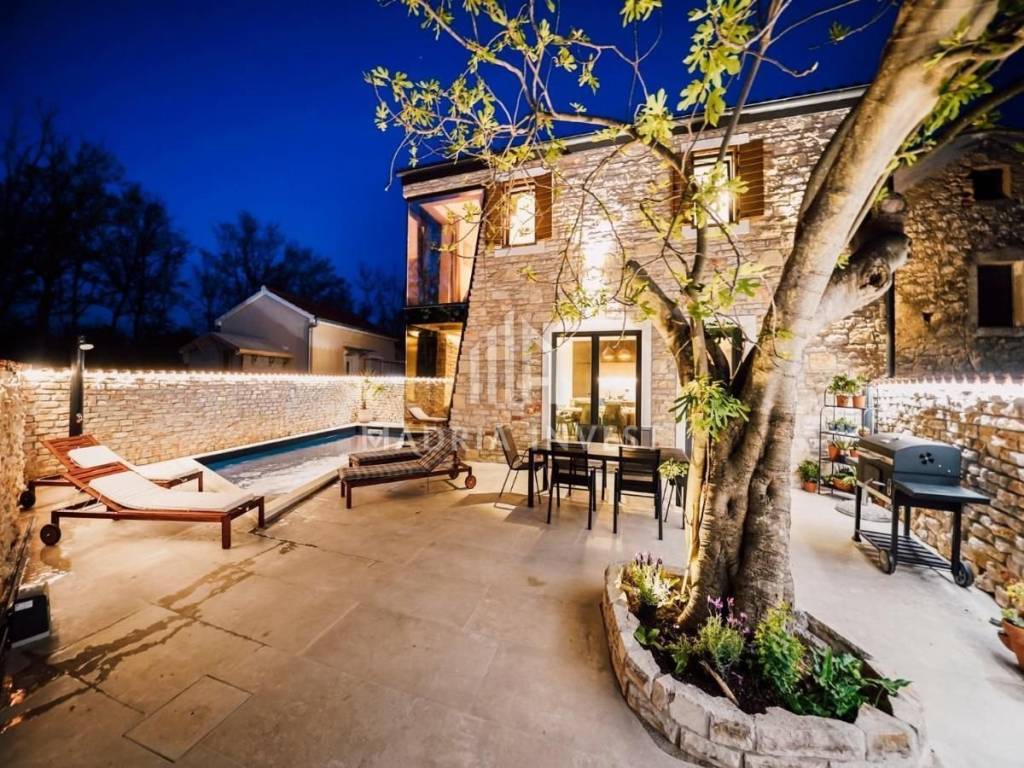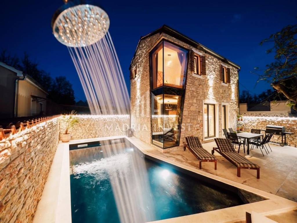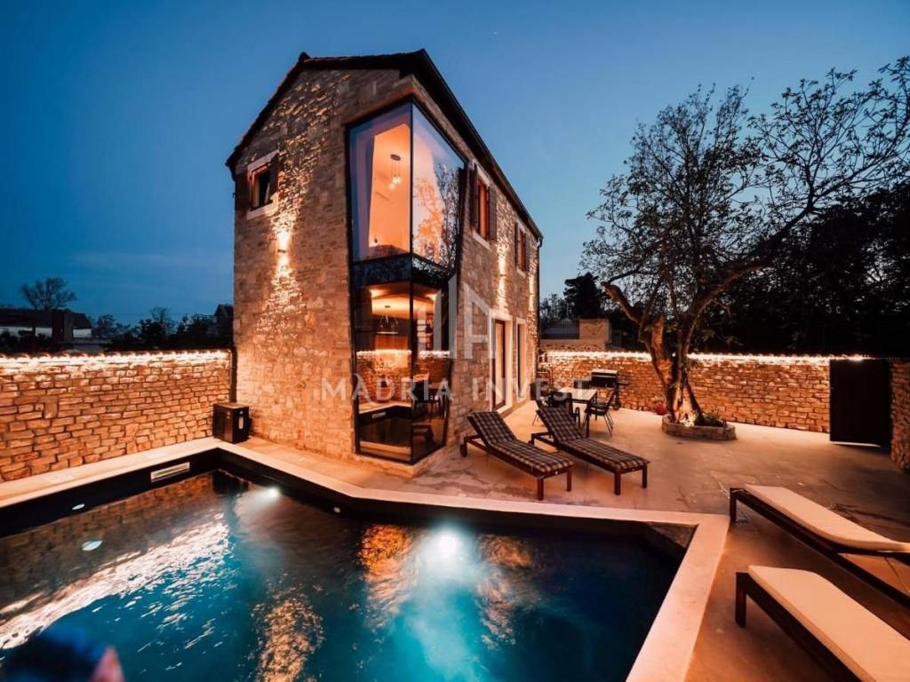For sale is a luxurious stone villa located in a quiet part of Privlaka. The villa consists of two floors. On the ground floor there is a living room with kitchen and dining room and a bathroom. A modern staircase leads to the second floor, where there are two bedrooms and a spacious bathroom. The whole house is a unique combination of modern architecture with a traditional Dalmatian stone house. A special feature is the glass wall that forms the entire corner of the house and connects the ground floor and the first floor without interruption. The house is built of stone and has been completely renovated. It is sold fully equipped with modern high-quality furniture and quality appliances. In the yard there is a swimming pool and a rest area. The pool is black in color and as such perfectly connects the modern architectural elements used in the house. The position is excellent for anyone who wants a vacation in peace and complete privacy, surrounded by Mediterranean greenery, and close to the beach and all facilities. The property is in order and all the documentation is complete.