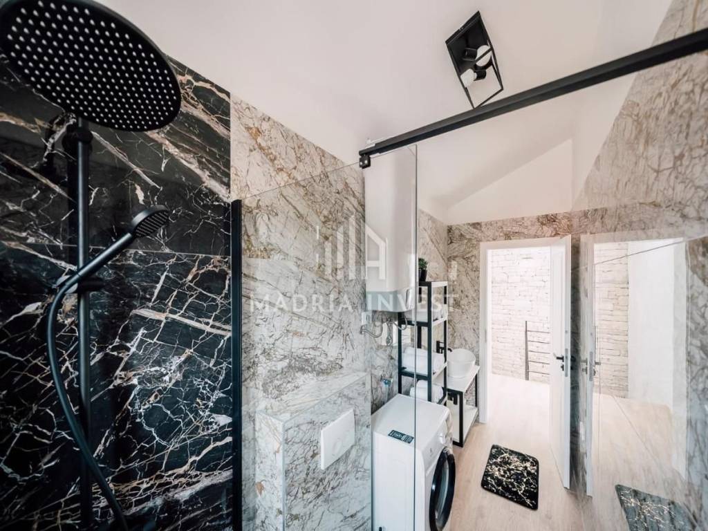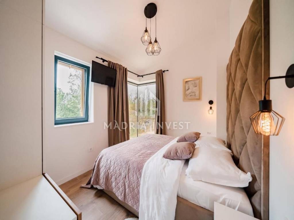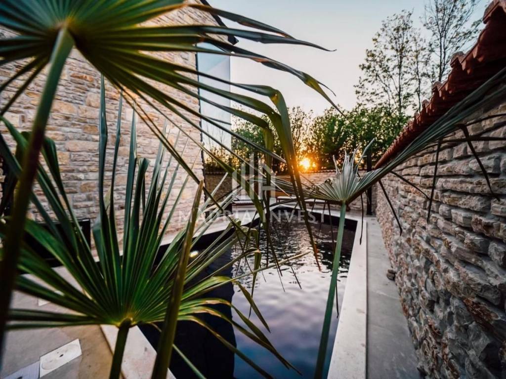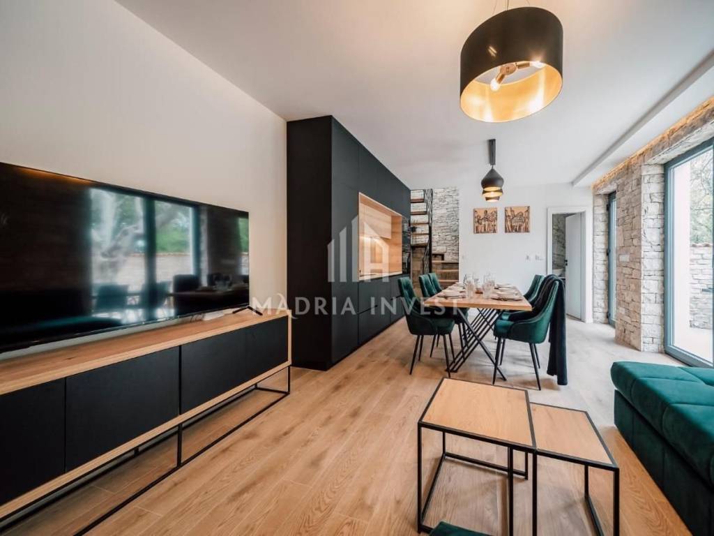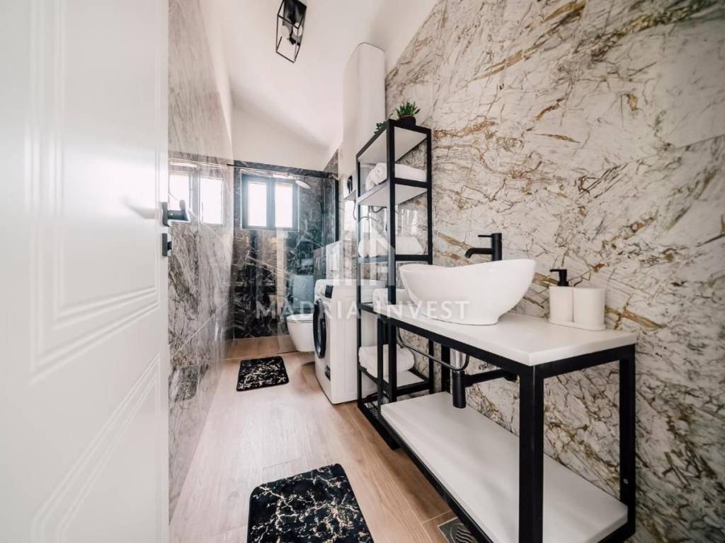 For sale is a luxurious stone villa located in a quiet part of Privlaka. The villa consists of two floors. On the ground floor there is a living room with kitchen and dining room and a bathroom. A modern staircase leads to the second floor, where there are two bedrooms and a spacious bathroom. The whole house is a unique combination of modern architecture with a traditional Dalmatian stone house. A special feature is the glass wall that forms the entire corner of the house and connects the ground floor and the first floor without interruption. The house is built of stone and has been completely renovated. It is sold fully equipped with modern high-quality furniture and quality appliances. In the yard there is a swimming pool and a rest area. The pool is black in color and as such perfectly connects the modern architectural elements used in the house. The position is excellent for anyone who wants a vacation in peace and complete privacy, surrounded by Mediterranean greenery, and close to the beach and all facilities. The property is in order and all the documentation is complete.