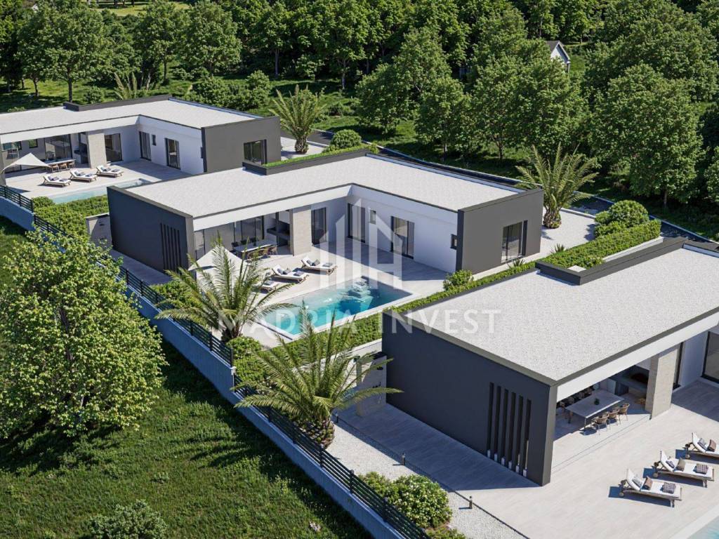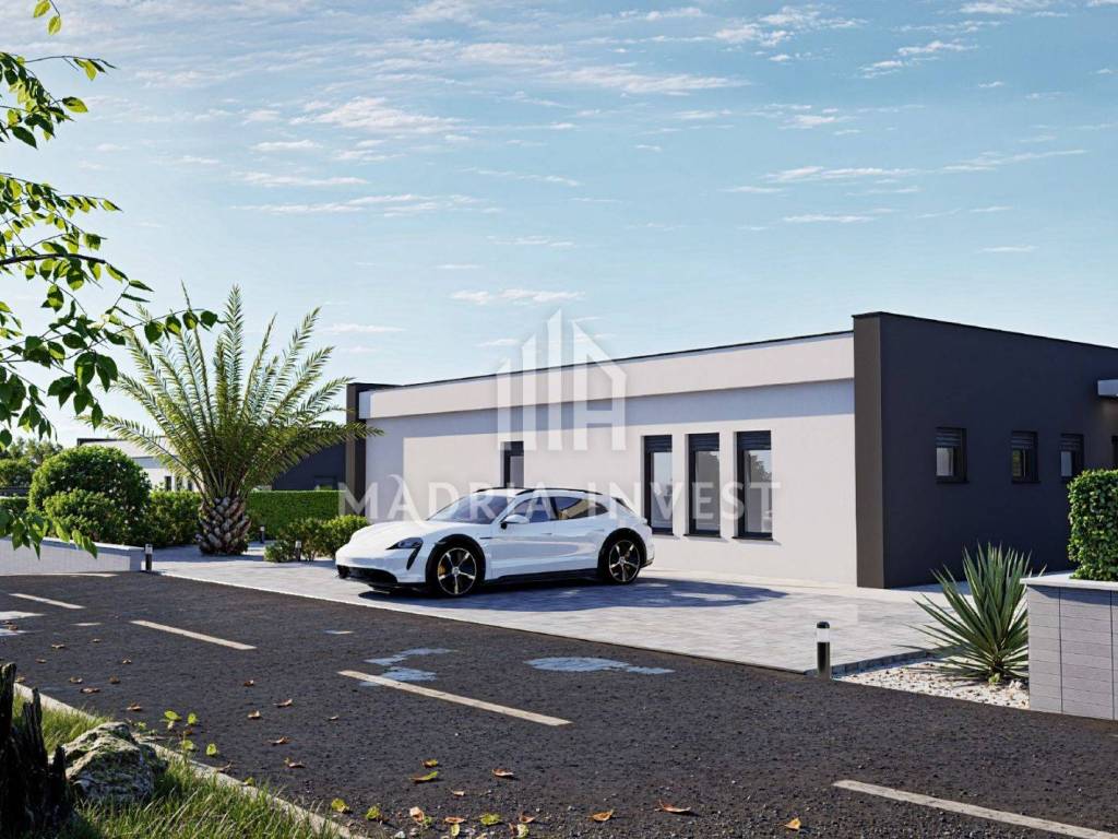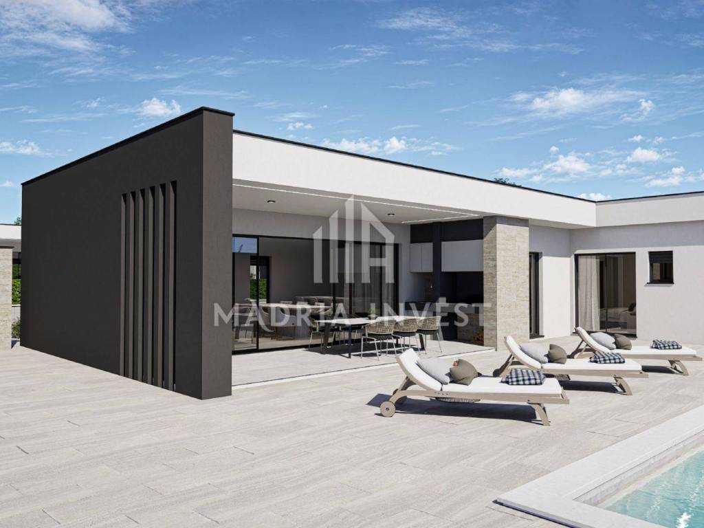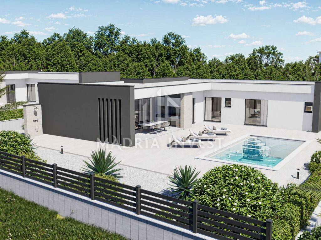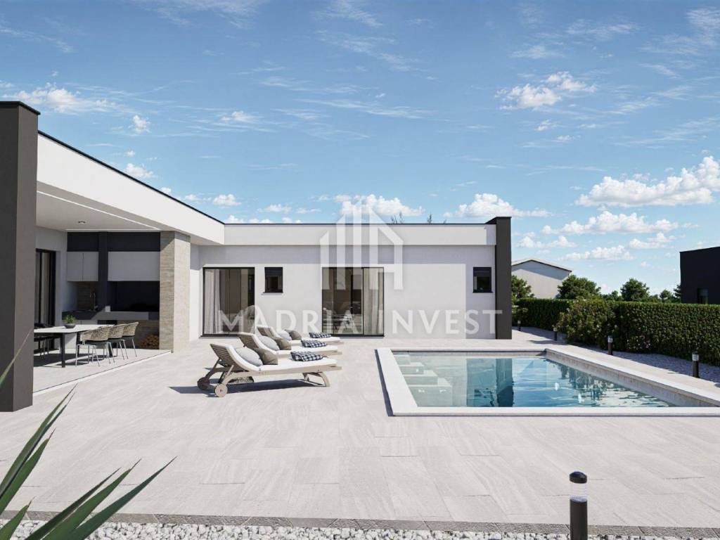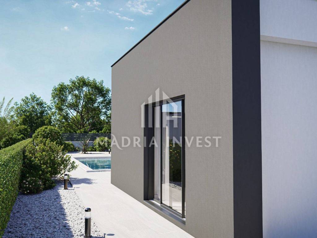 We offer two luxury villas in Smoković, each at a price of EUR 650,000.00. The villa consists of: - entrance, - hallway, - kitchen/dining room + living room, - toilet, - laundry/storage room, - sauna, - 3 bedrooms (each room has a bathroom, and two rooms have a wardrobe) - loggia. The total area of the residential part is 163.80 m2. Each villa has a private pool, a garden of 268 m2 and a parking area of 74 m2. Construction will begin in February 2025, and the planned completion date is summer 2026.