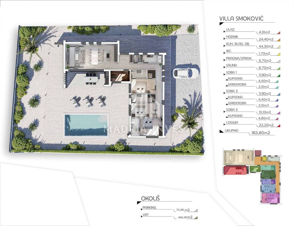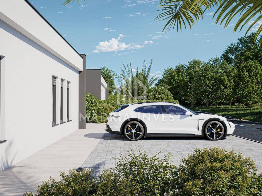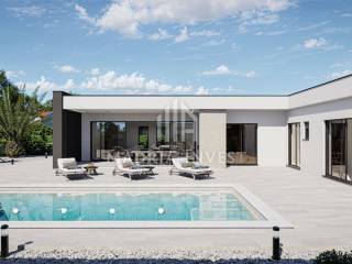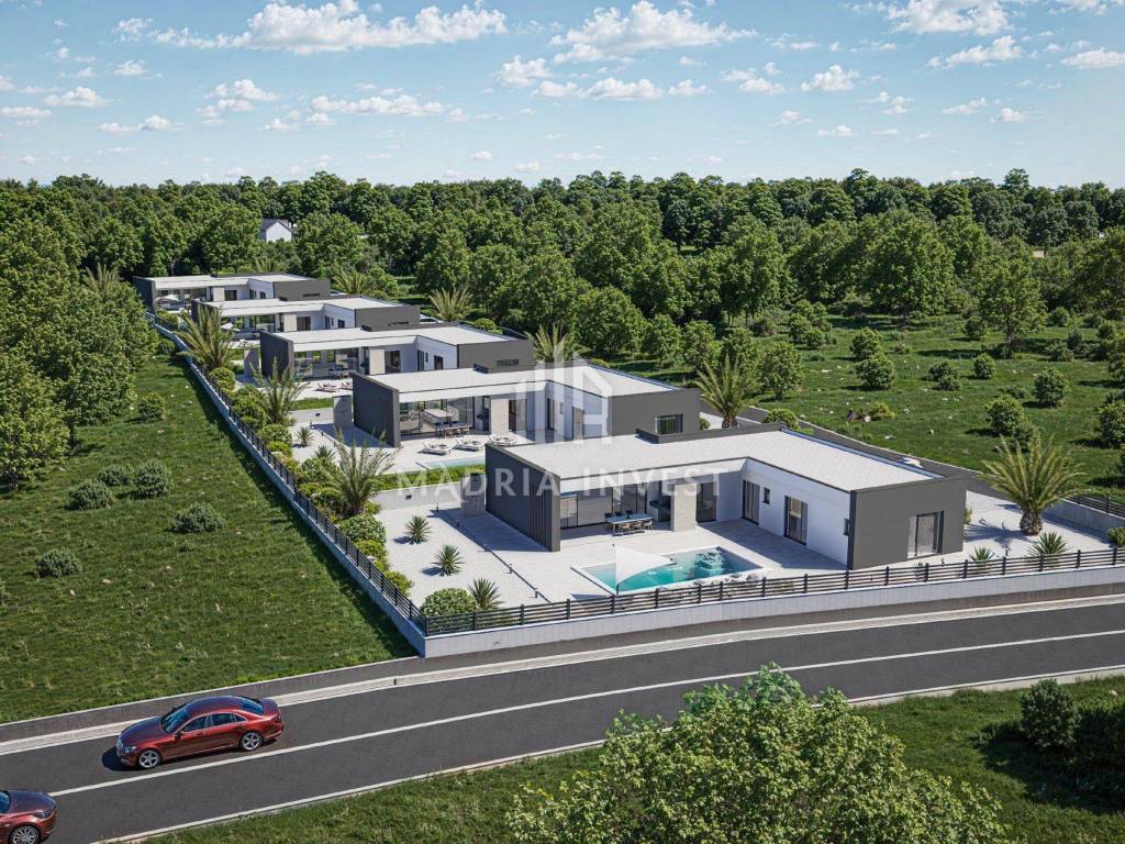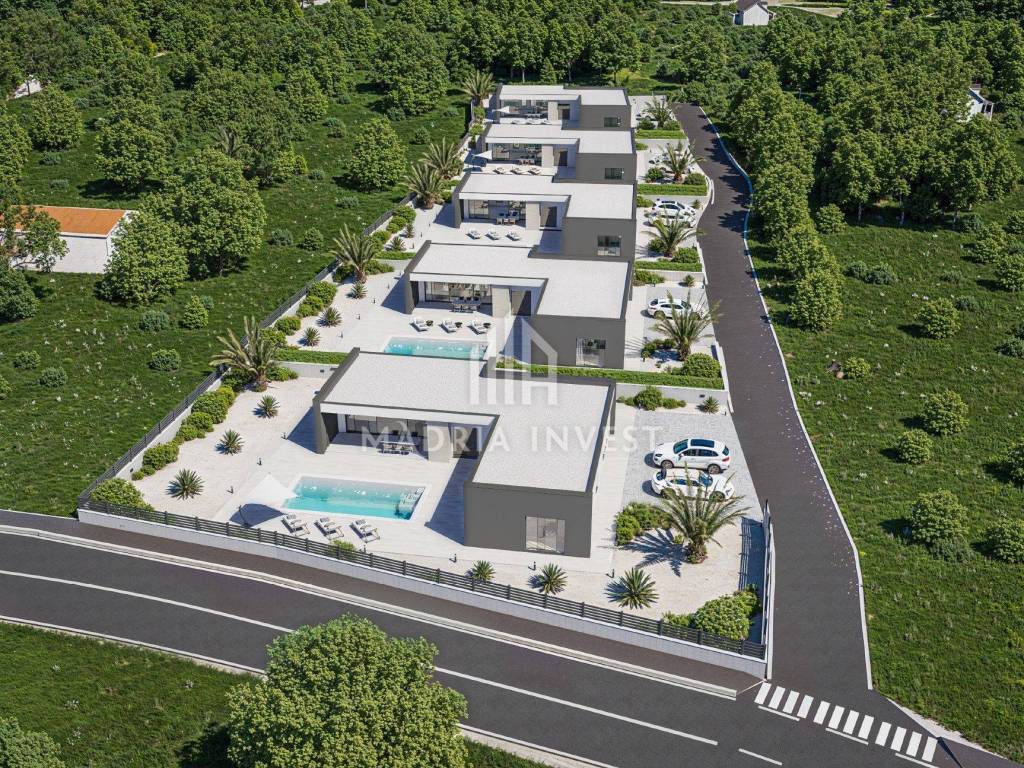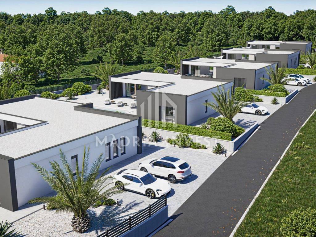 We offer two luxury villas in Smoković, each at a price of EUR 650,000.00. The villa consists of: - entrance, - hallway, - kitchen/dining room + living room, - toilet, - laundry/storage room, - sauna, - 3 bedrooms (each room has a bathroom, and two rooms have a wardrobe) - loggia. The total area of the residential part is 163.80 m2. Each villa has a private pool, a garden of 268 m2 and a parking area of 74 m2. Construction will begin in February 2025, and the planned completion date is summer 2026.