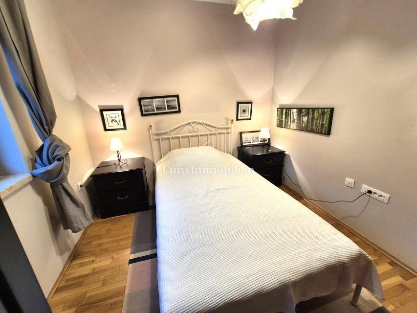 A fully furnished duplex apartment of 84 m2 is for sale in the vicinity of Malinska. On the first floor there is a kitchen with a dining room with access to a large covered terrace, a living room, a bedroom, a hallway and a bathroom. Internal stairs lead to the attic, which is a large bedroom with a bathroom. The apartment is located only 300 m from the sea, fully furnished, and was completely renovated in 2016. It has a parking space in the courtyard of the building, and all documentation is in order. Opportunity for self-use or tourist rental.
