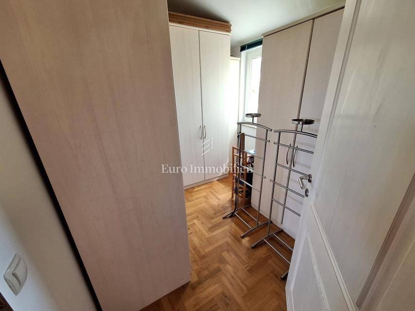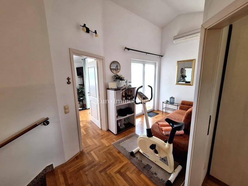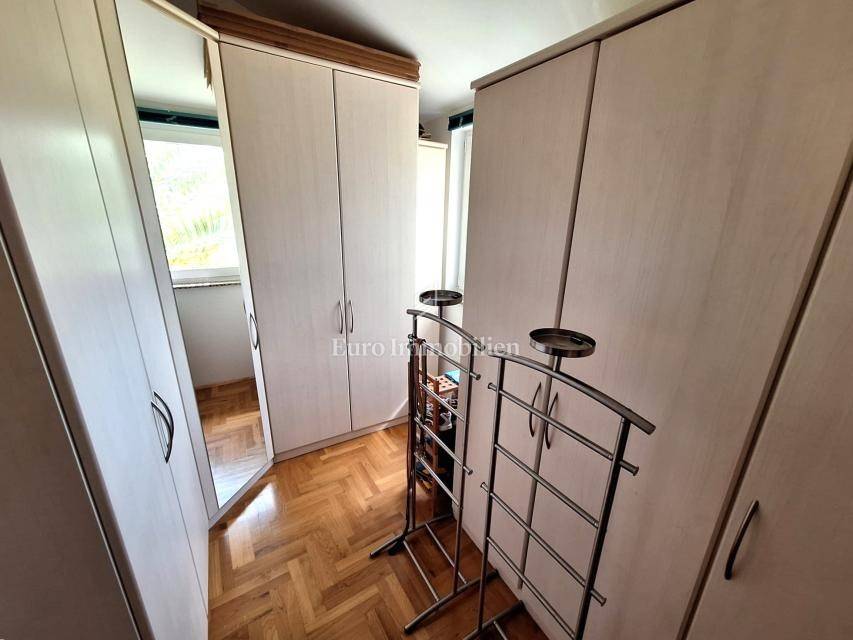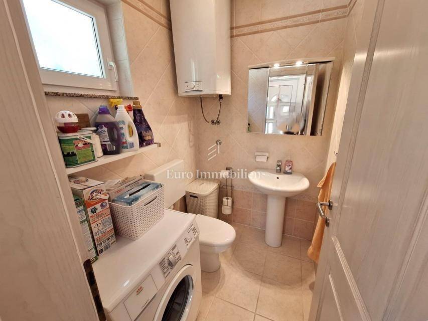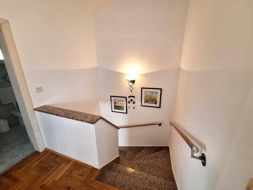 The house consists of a living room, kitchen and dining room, toilet, storage room, entrance hall and terrace, while on the first floor there are two bedrooms (one is currently arranged as a dressing room), hallway, bathroom and terrace with a sea view.