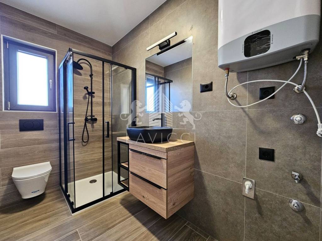 The building was built with quality materials. The carpentry is PVC anthracite color with aluminum blinds with electric lifters and mosquito nets. The floors are covered with ceramic tiles. Heating and cooling is done through a multi-split air conditioning system. In addition to heating, electric underfloor heating was implemented in all rooms. Burglar and fire doors have been installed. The 10 cm thick styrofoam facade contributes to energy efficiency.