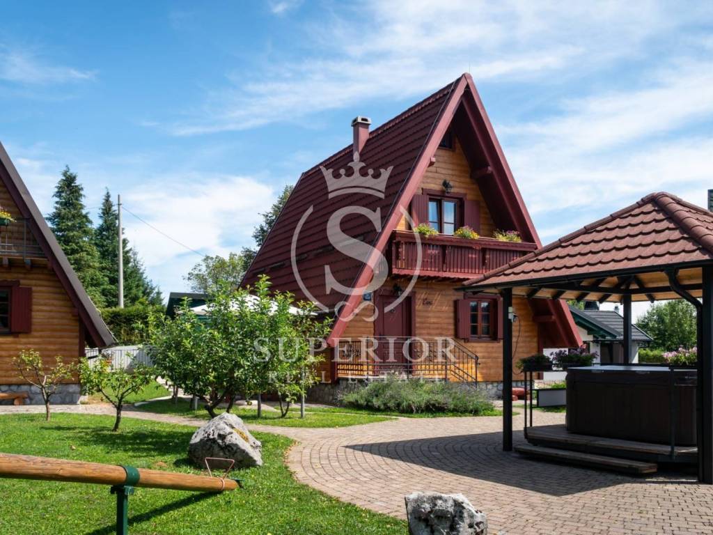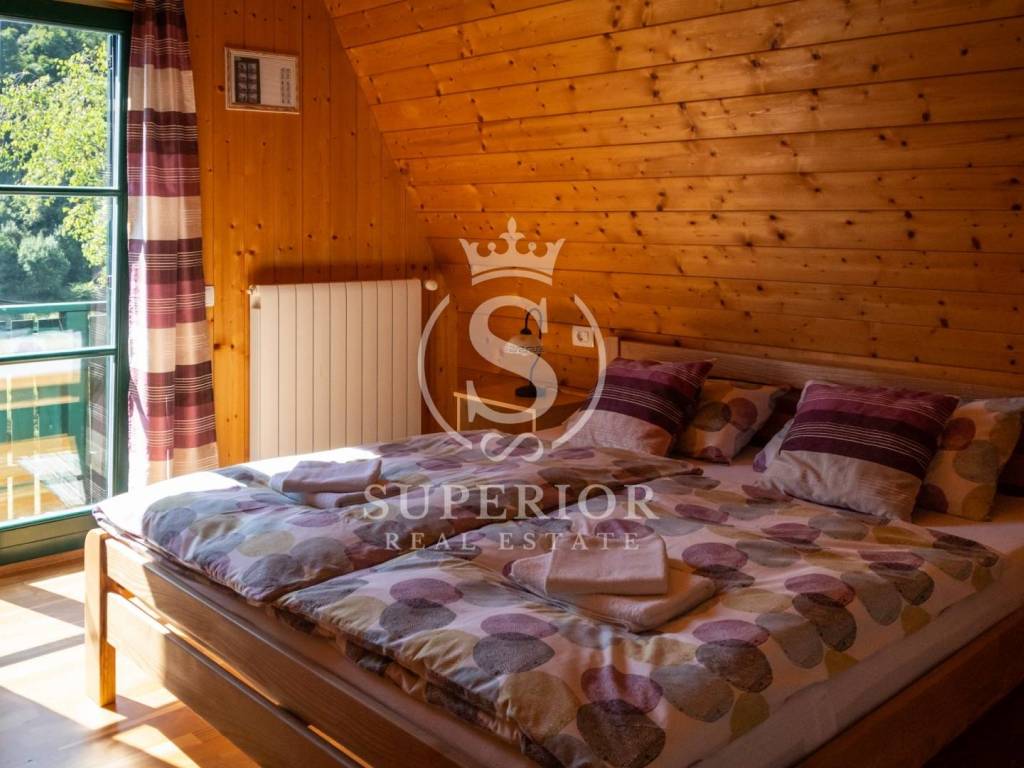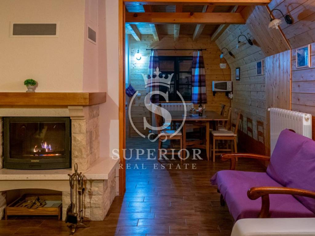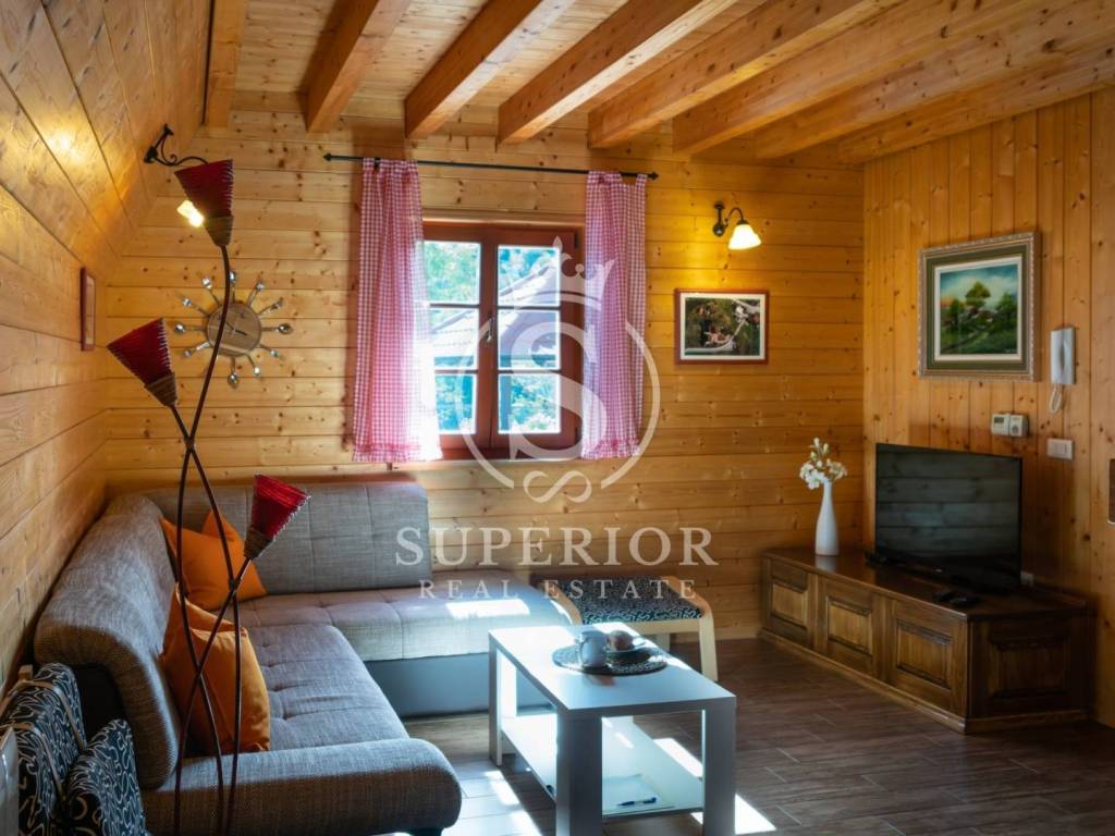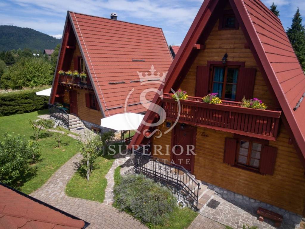 This unique investment opportunity includes four luxury wooden houses, an outdoor swimming pool with jacuzzi, an additional wellness building with sauna and tavern, and a fully operational tourist business.