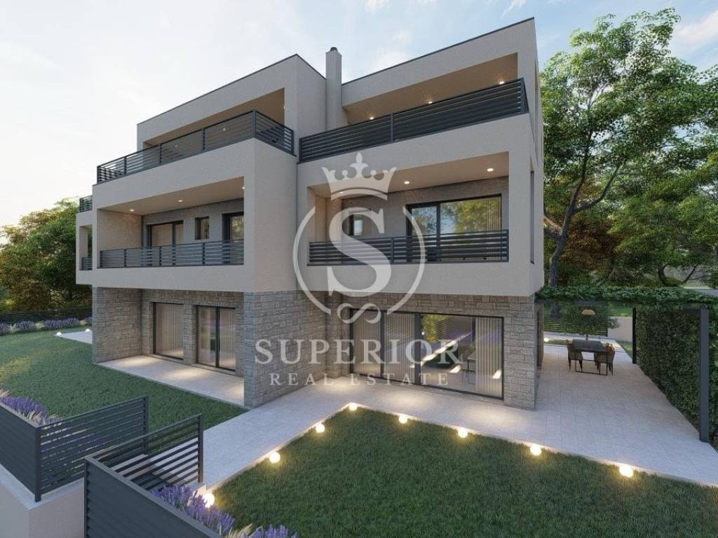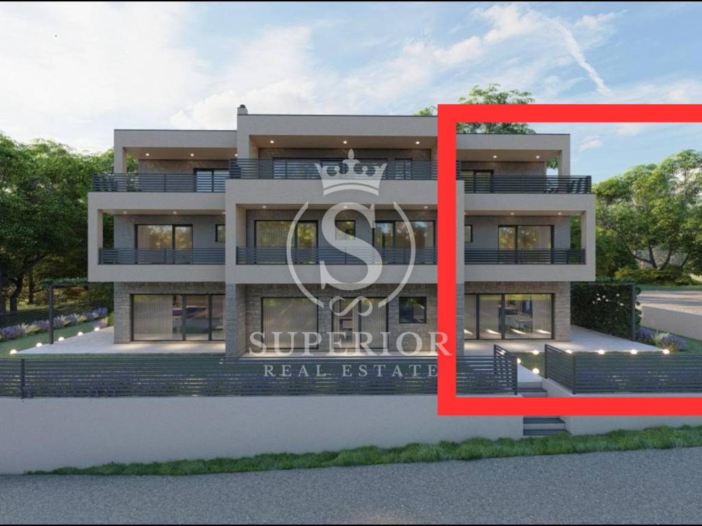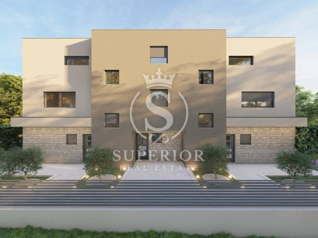 A modern house under construction, with a total area of 117 m2, located only 1.8 km from the beautiful beaches of Umag, is now for sale. This is the last available unit in the row, situated in a peaceful and pleasant environment. The property extends over three floors and offers a functional layout, privacy, and high-quality construction. The ground floor includes a spacious open-space living room with kitchen and dining area, a guest toilet, and access to the terrace and landscaped garden with 2 parking spaces. The first floor features two bedrooms, a bathroom, and a storage room, while the second floor offers a master bedroom with en-suite bathroom, wardrobe space, and a terrace.