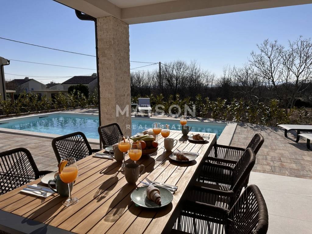 The villa's outdoor space is a true oasis for relaxation and enjoyment. The pool, surrounded by elegant loungers and garden furniture, creates the perfect atmosphere for summer days, while the covered terrace and summer kitchen with a barbecue offer an ideal space for socializing and culinary delights.