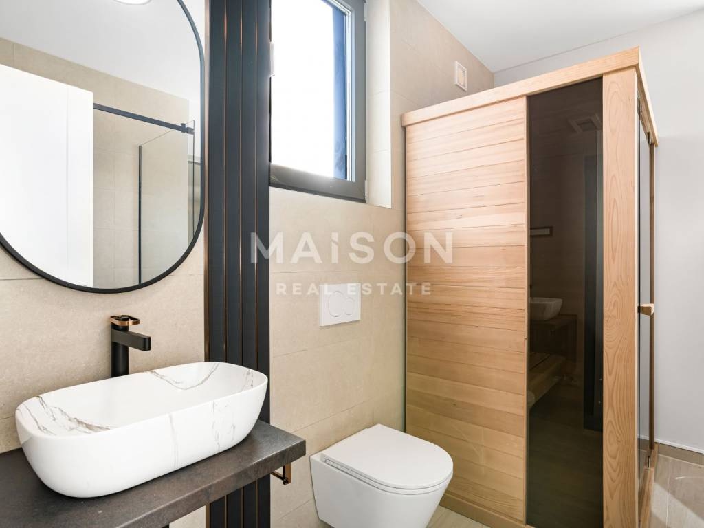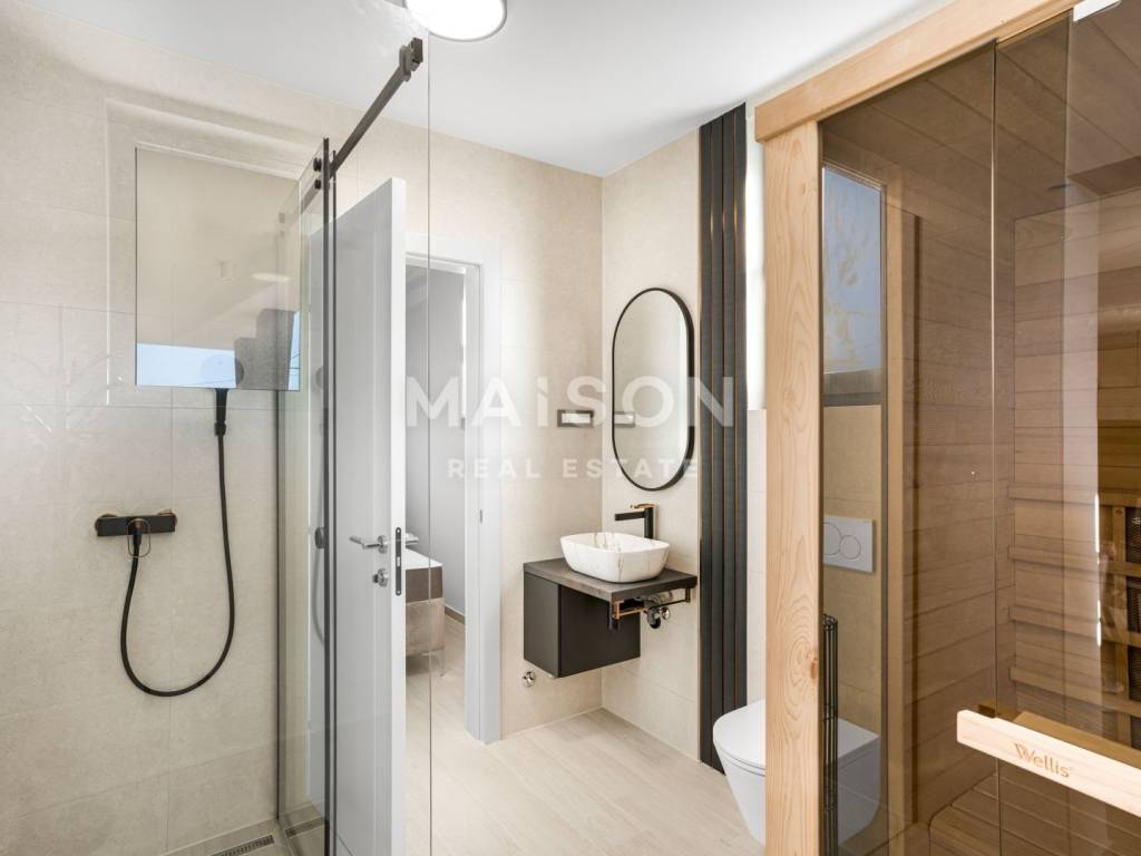 The ground floor comprises an open-plan kitchen with dining area, a spacious living room with access to a covered terrace - the perfect spot for relaxing summer evenings - a guest toilet, sauna, and storage room. The upper floor features three comfortable bedrooms, each with its own en-suite bathroom and access to a terrace with sea views, adding to the exclusivity of the space.