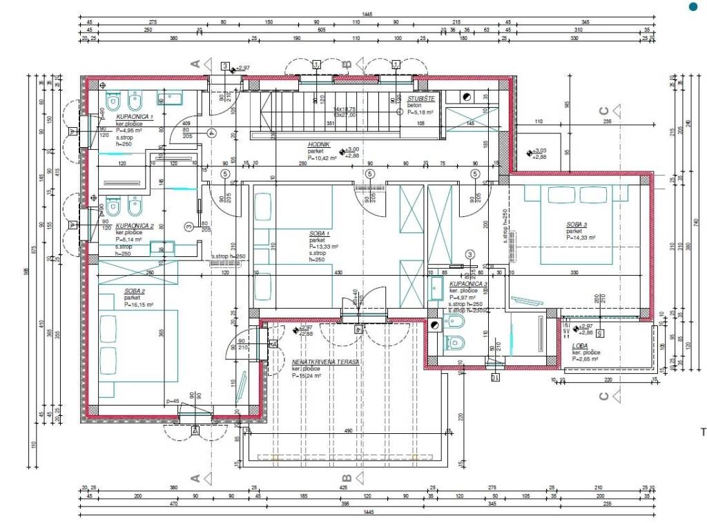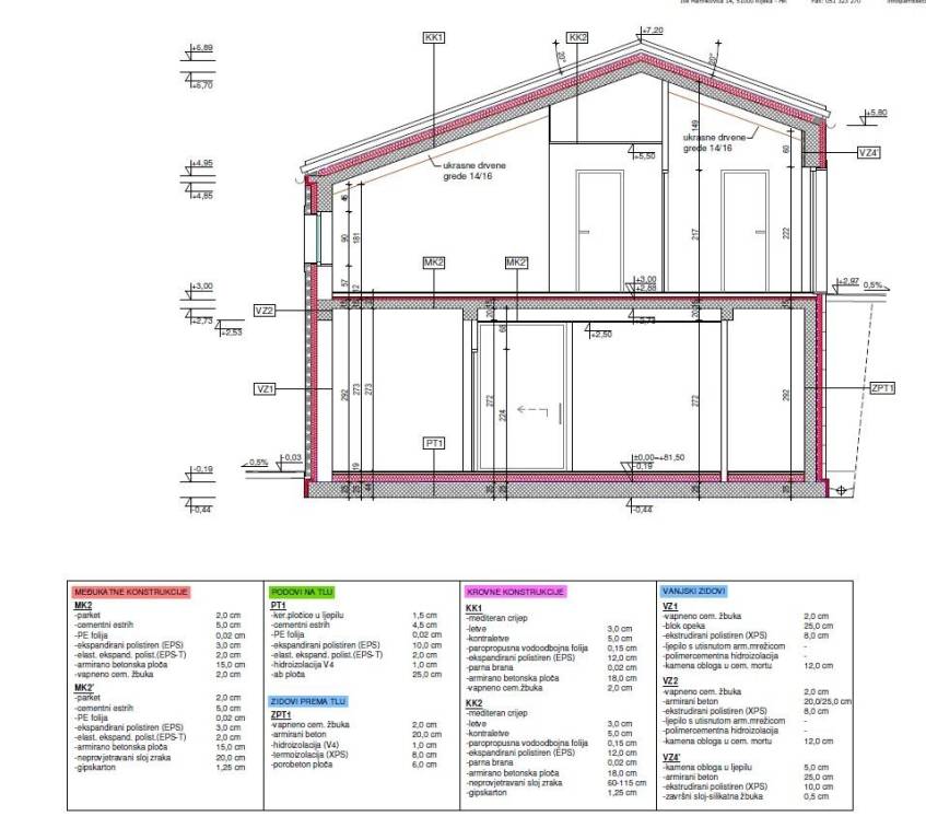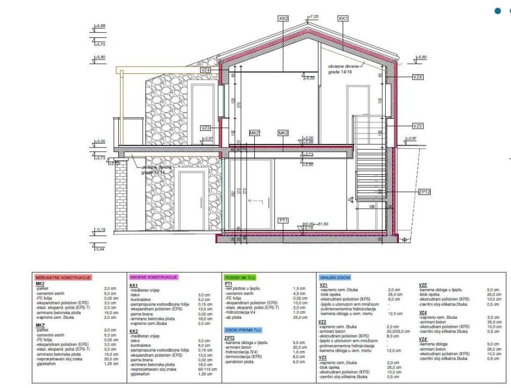 A new detached house with a living area of 150 m2 in a quiet place near Vrbnik for sale. The house has two floors, ground floor and first floor, which are connected by internal stairs.