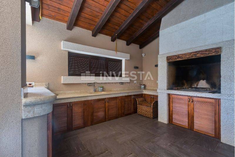 From the living room, there is access to a covered terrace and the area where the large pool with a sunbathing area and outdoor kitchen is located.