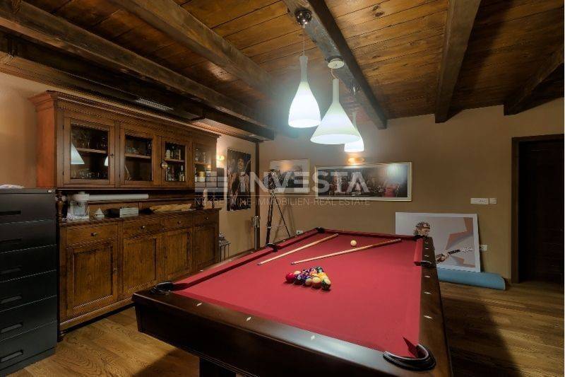 In the basement, there is a beautiful wine cellar and a leisure room featuring a billiard table and a relaxation area, music room.