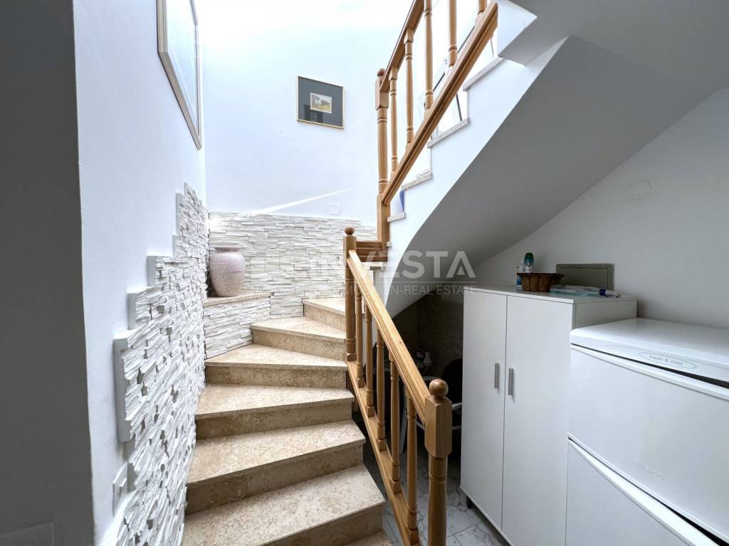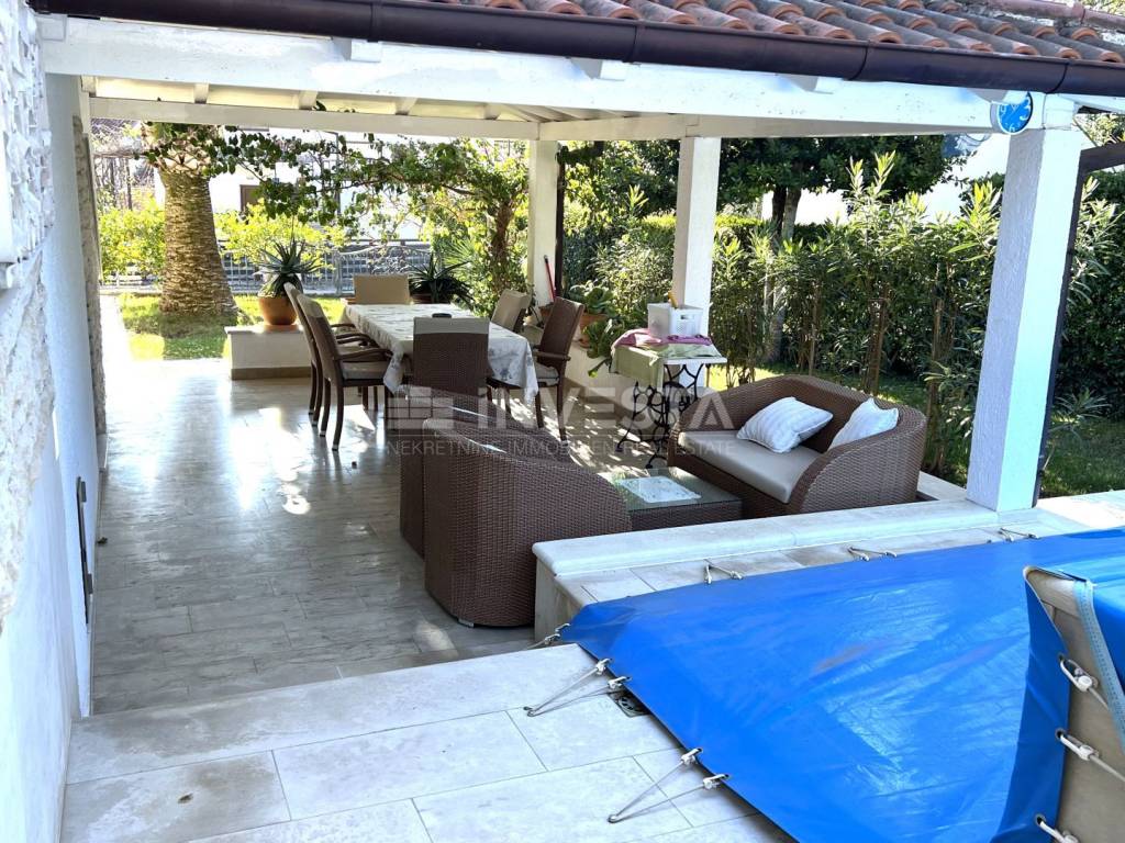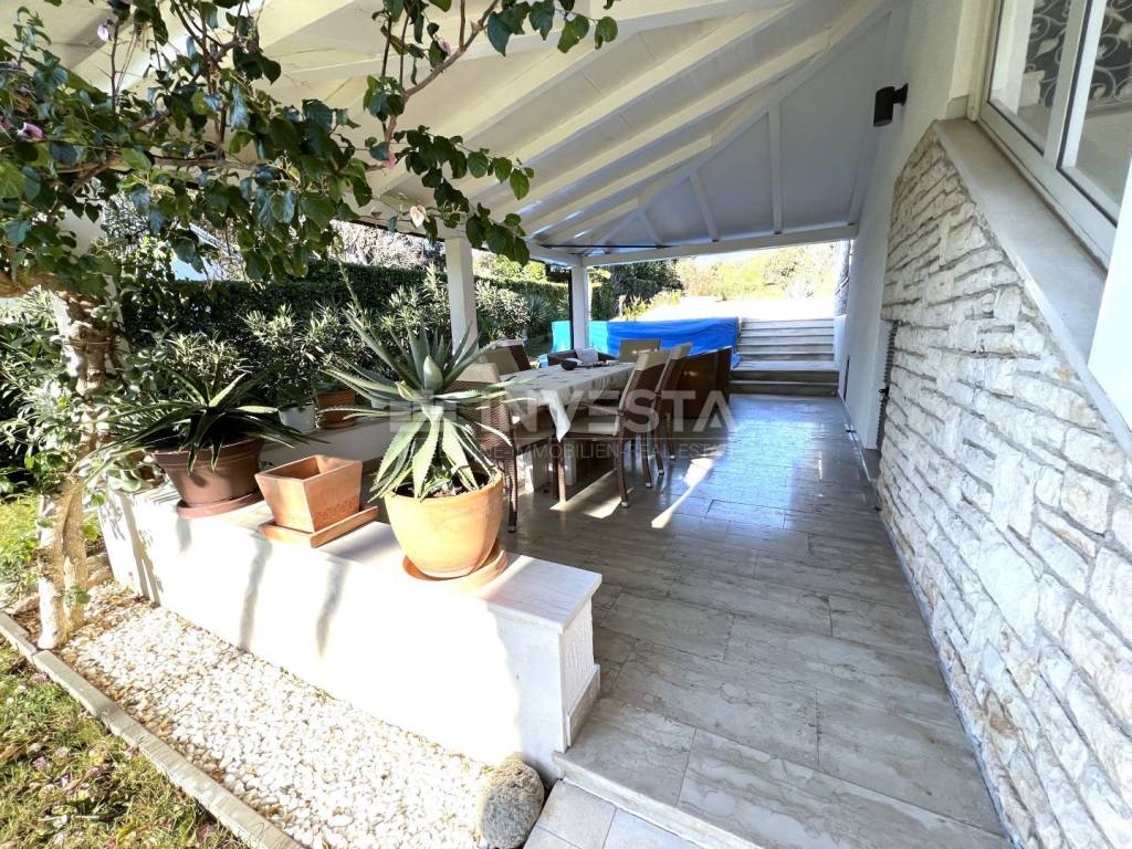 For sale is a spacious house located in a peaceful setting near Pula, just 300 meters from the coastline and beaches. Surrounded by lush greenery, this residential property, with a total gross area of 530 m², is situated on a plot of 763 m². The well-maintained garden features a heated pool with a sunbathing area, covered terraces, and an outdoor fireplace.