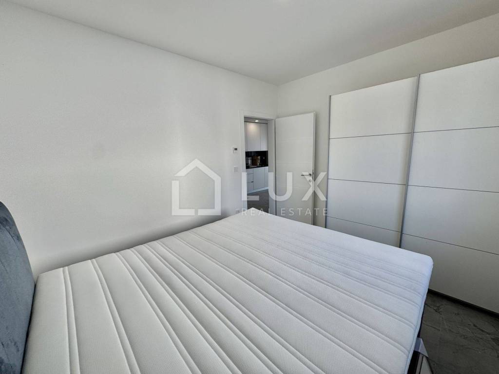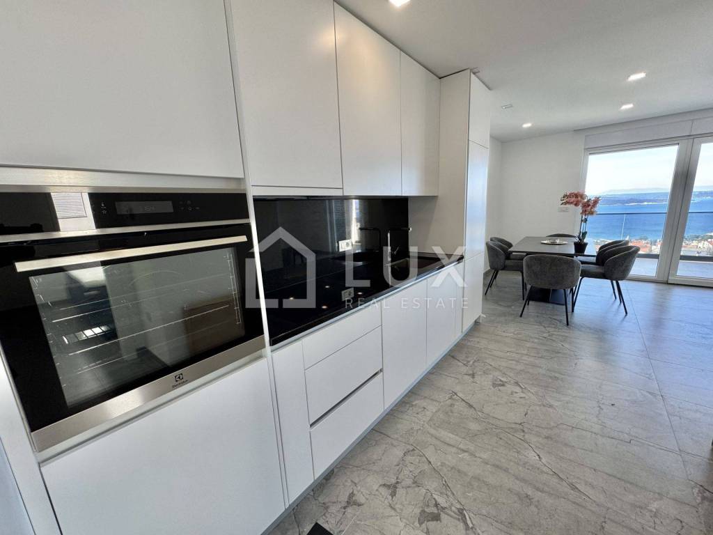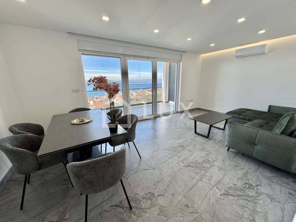 It consists of a living room with a dining room and a kitchen, two bedrooms, a bathroom and a spacious terrace with a beautiful panoramic view of the sea and the island of Krk. The apartment has two parking spaces. It is equipped with PVC carpentry, electric aluminum blinds, air conditioning and underfloor heating that extends throughout the entire surface of the apartment.