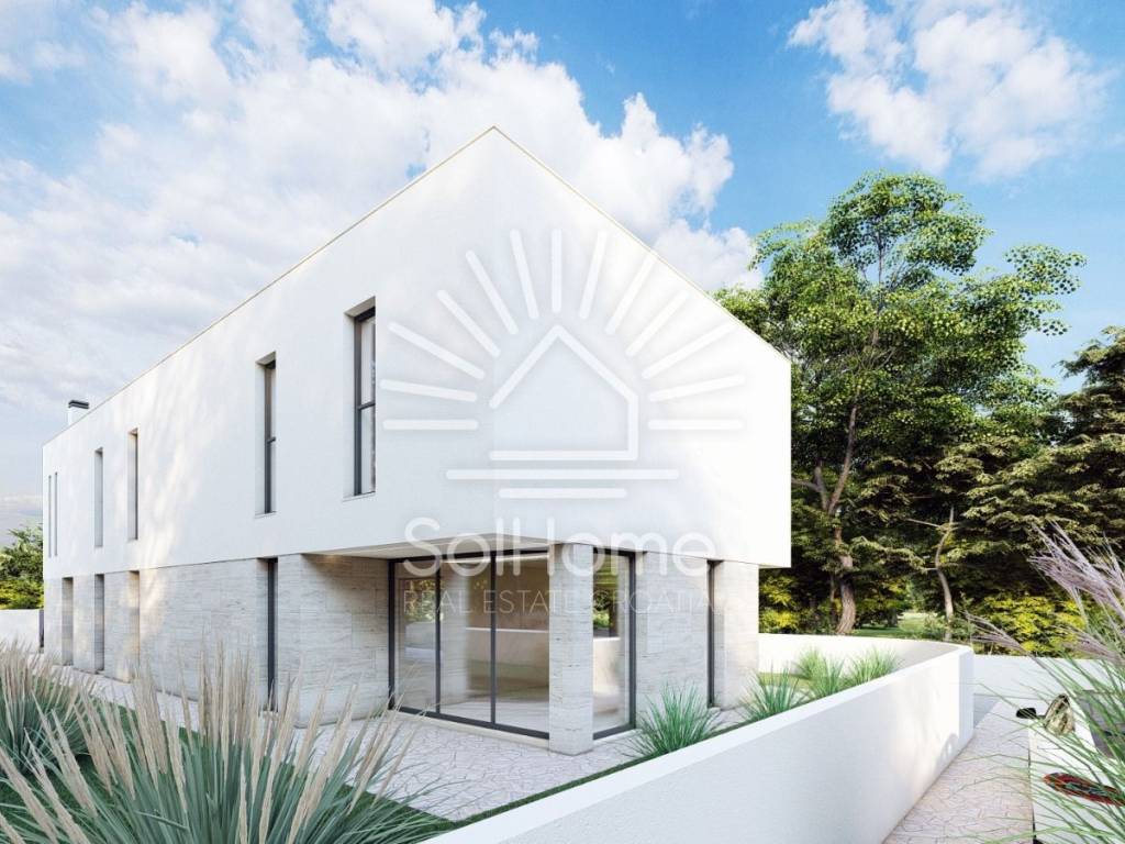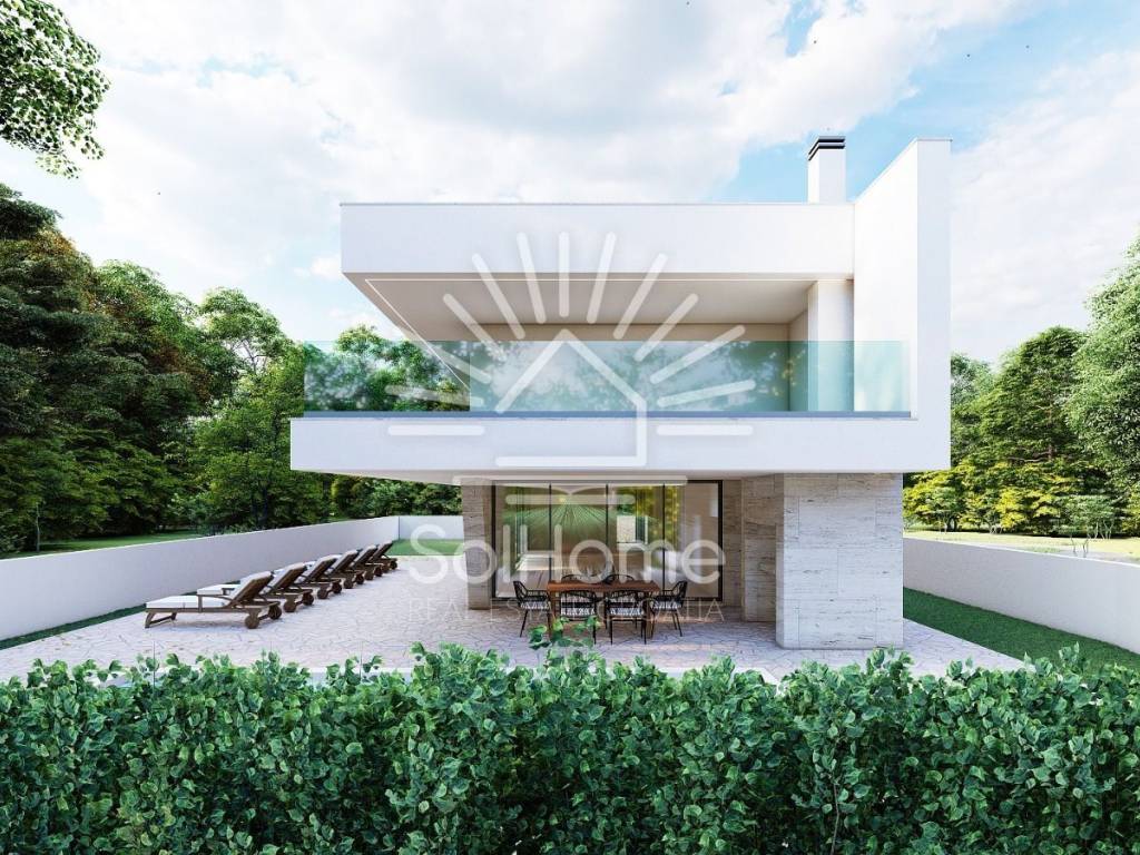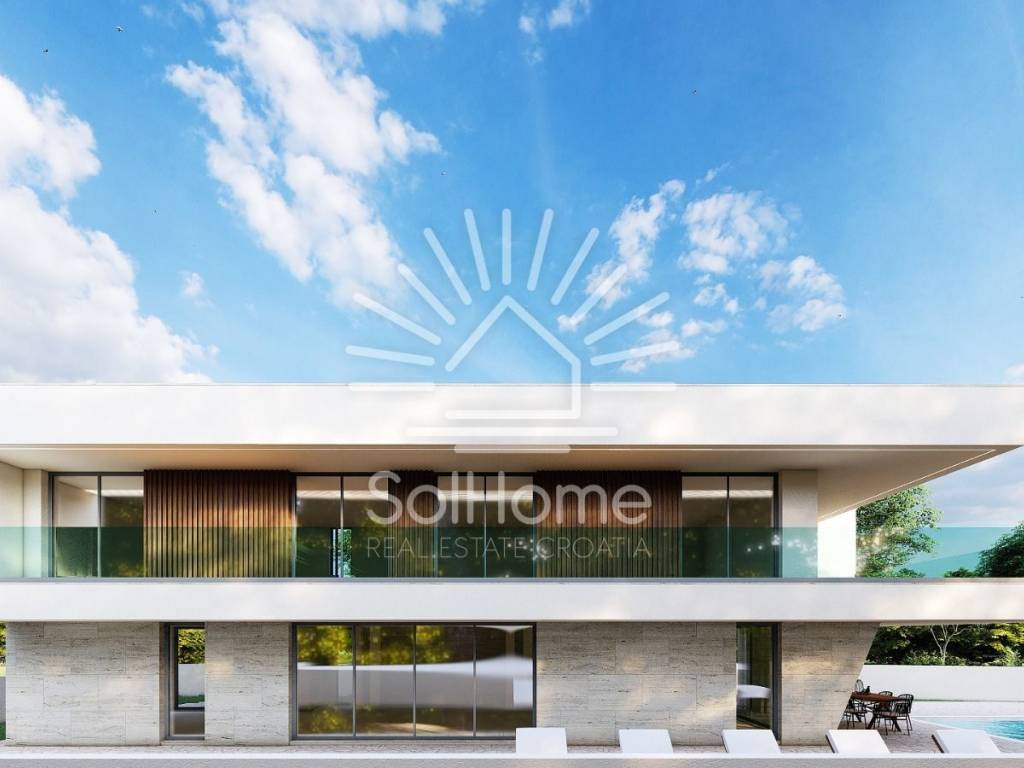 Project Details: A modern and elegant villa with 163 m² of net indoor space and a gross area of 259.5 m². The ground floor features a living room, kitchen, dining area, storage room, guest WC, laundry room, and machine room. A covered terrace leads to a 32 m² pool. The first floor includes four bedrooms, two bathrooms, and a spacious covered terrace with breathtaking sea views.
