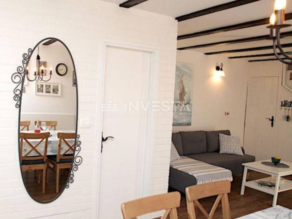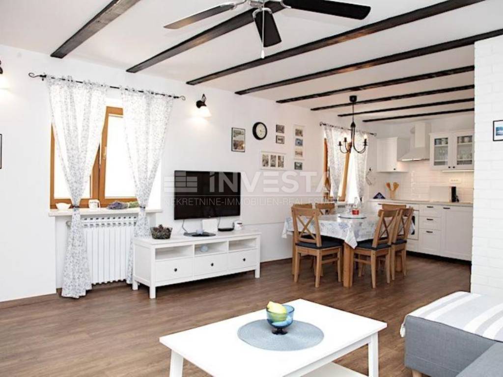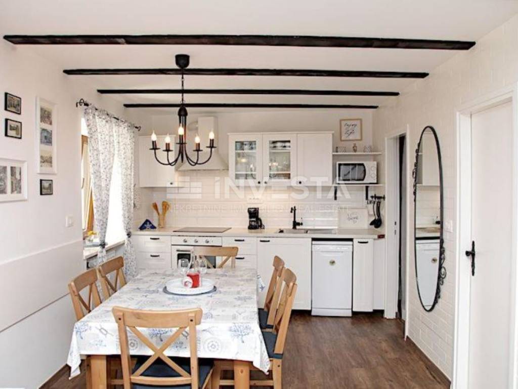 This beautiful stone Istrian house, renovated in 2020, is for sale, located in a quiet area of Medulin, just 650 meters from the coastline and beaches. The house spans two floors and is situated on a landscaped plot. The well-maintained garden also features a terrace. The house consists of a ground floor and first floor, offering the perfect combination of comfort and functionality. On the ground floor, there is a living room with a fully equipped kitchen and dining area, a pantry, and a guest WC. On the first floor, there are two bedrooms with one bathroom. The entire house is air-conditioned, ensuring comfort throughout the year.