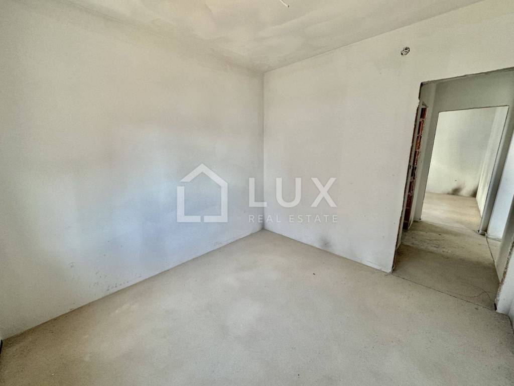 The apartment is located on the ground floor of a small residential building and consists of an entrance hall, an open-plan living room with kitchen and dining room, a bathroom, two bedrooms, a utility room and a spacious loggia with a sea view. The apartment also has one parking space.