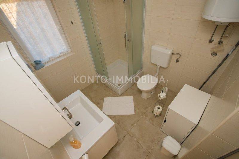 On the first floor there is a three-bedroom apartment with the same layout as on the high ground floor, but the bathroom has a bathtub. The apartment has an unobstructed view of the sea and two covered balconies (14 m² and 12 m²).