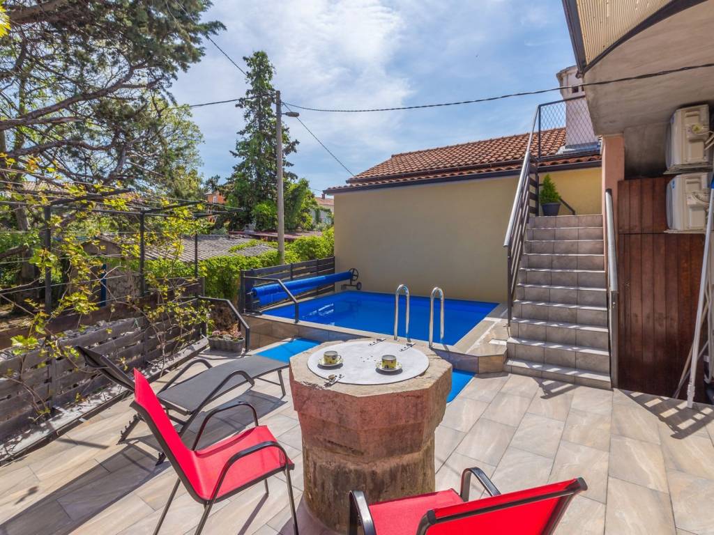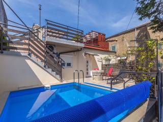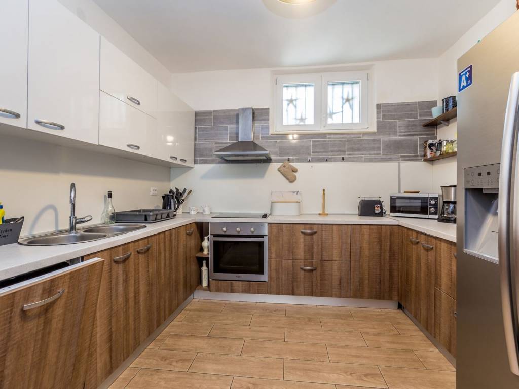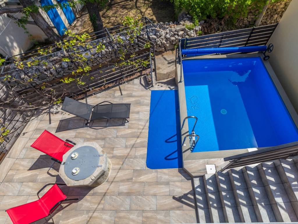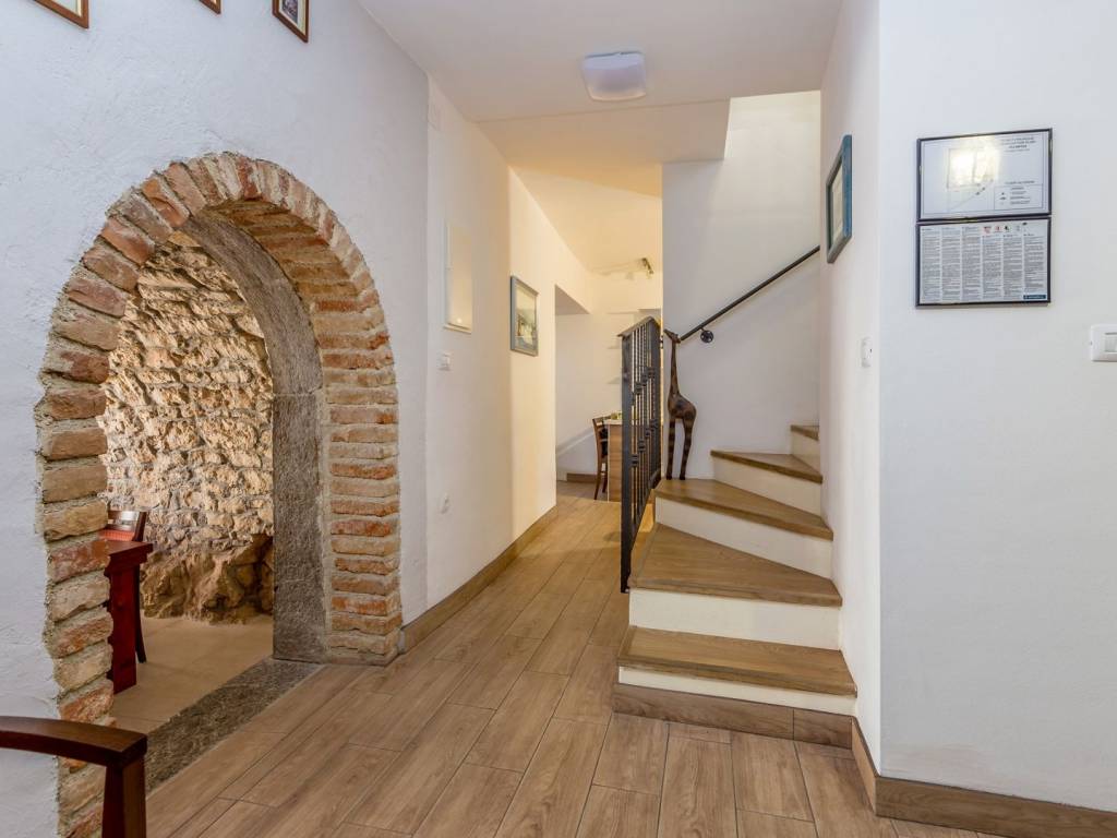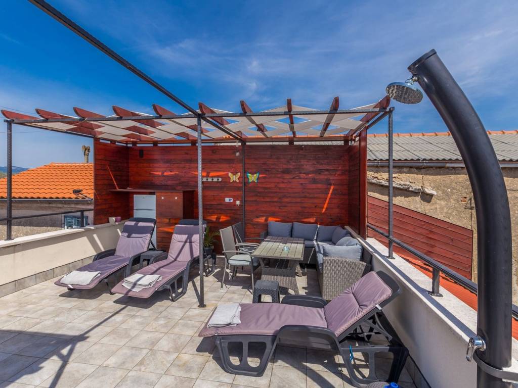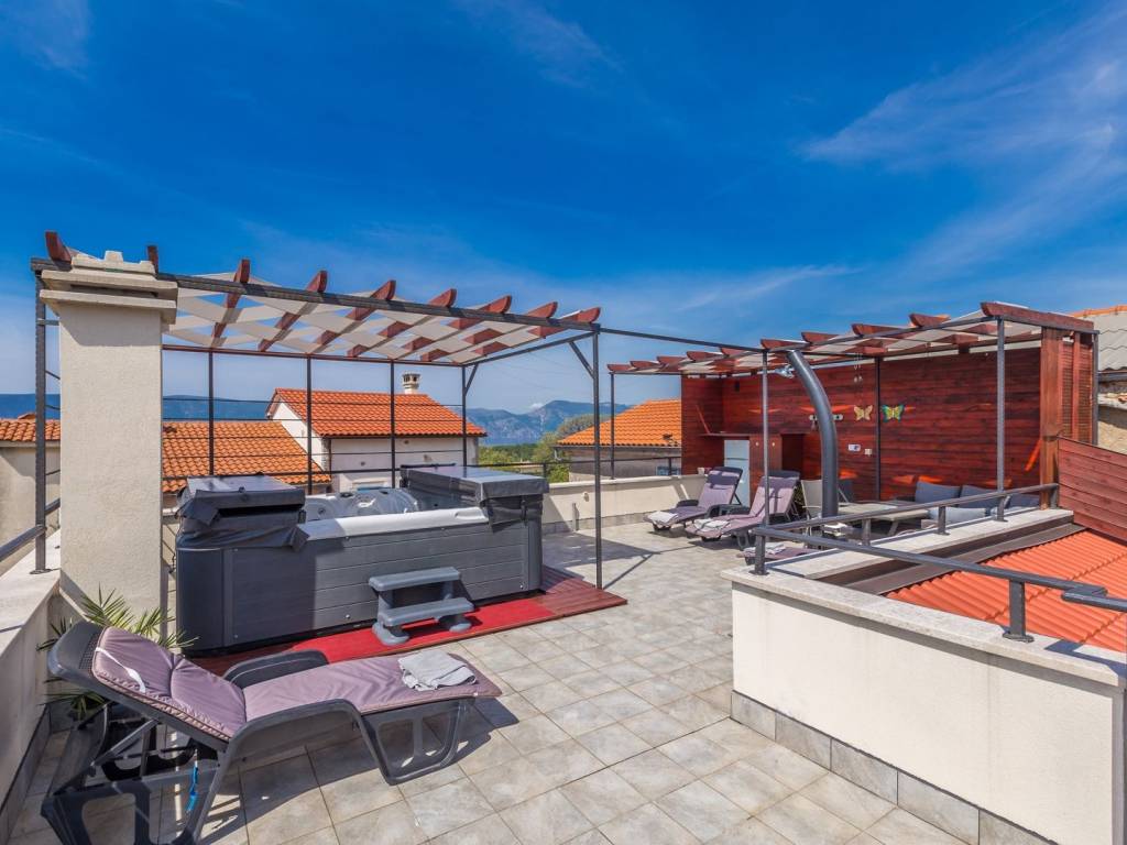 In a quiet location near the town of Krk, this charming stone terraced house is located, ideal for relaxing and enjoying the Mediterranean lifestyle. Combining traditional architecture with modern amenities, this property offers the perfect blend of authenticity and luxury. The house extends over three floors – ground floor, first floor and a spacious roof terrace. The ground floor has a comfortable living room with kitchen and dining area, additional toilet, storage room, tavern and a specially decorated entertainment room. Upstairs are four elegant bedrooms, each with its own bathroom, dressing room, additional toilet and terrace with heated pool. An external staircase leads to a spectacular 22 m² roof terrace, where you can enjoy a jacuzzi and unforgettable panoramic views, especially towards the island of Cres. The house is sold fully furnished and equipped for maximum comfort. The garden has enough parking spaces for several vehicles, and the entire environment provides peace and privacy necessary for a complete vacation. If you are looking for a unique property on Krk that combines luxury, views and authentic charm, this house is a choice that rarely appears.