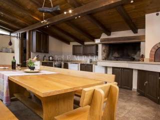 It consists of a kitchen with a living room and dining area, six bedrooms with bathrooms, a hallway, a summer kitchen with a wood stove and dining area, a loggia, and a covered terrace.