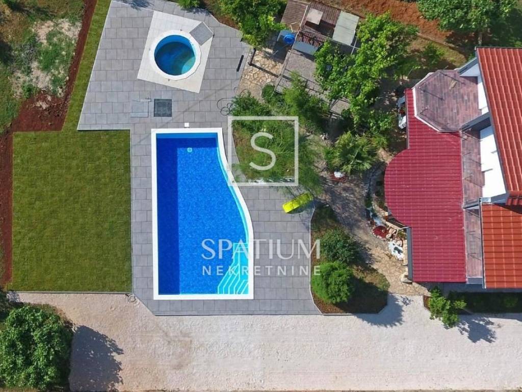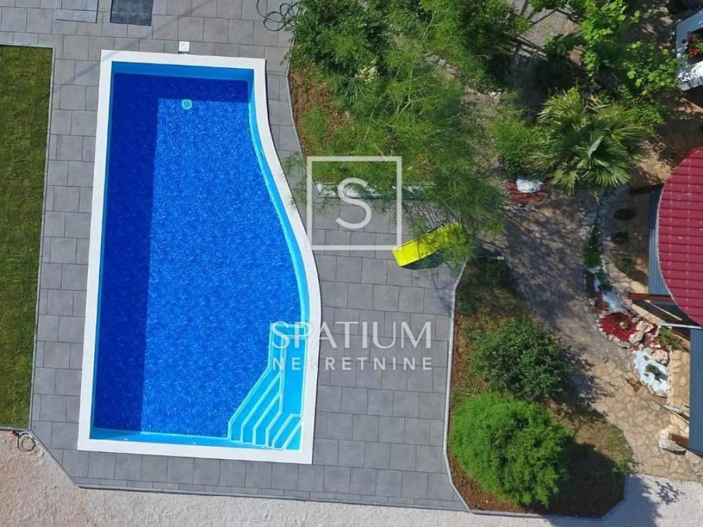ZADAR, DEBELJAK, We offer a modern villa with a swimming pool. The building has a total living area of 239.46 m2, and a plot of 1497 m2. On the ground floor there are one one-room and one two-room apartments with separate entrances. The upper floor with a view of the sea is in the Roh Bau edition and requires investment. In the spacious yard there is a heated swimming pool, a garden and a children's playground. Private parking is also available. The villa was renovated in 2017, when the facade was renovated, and in 2022, the two-room apartment on the ground floor was completely renovated. Ceramic tiles and laminates were used for the floor coverings, and the joinery is PVC. This property has the potential for further tourism activity.