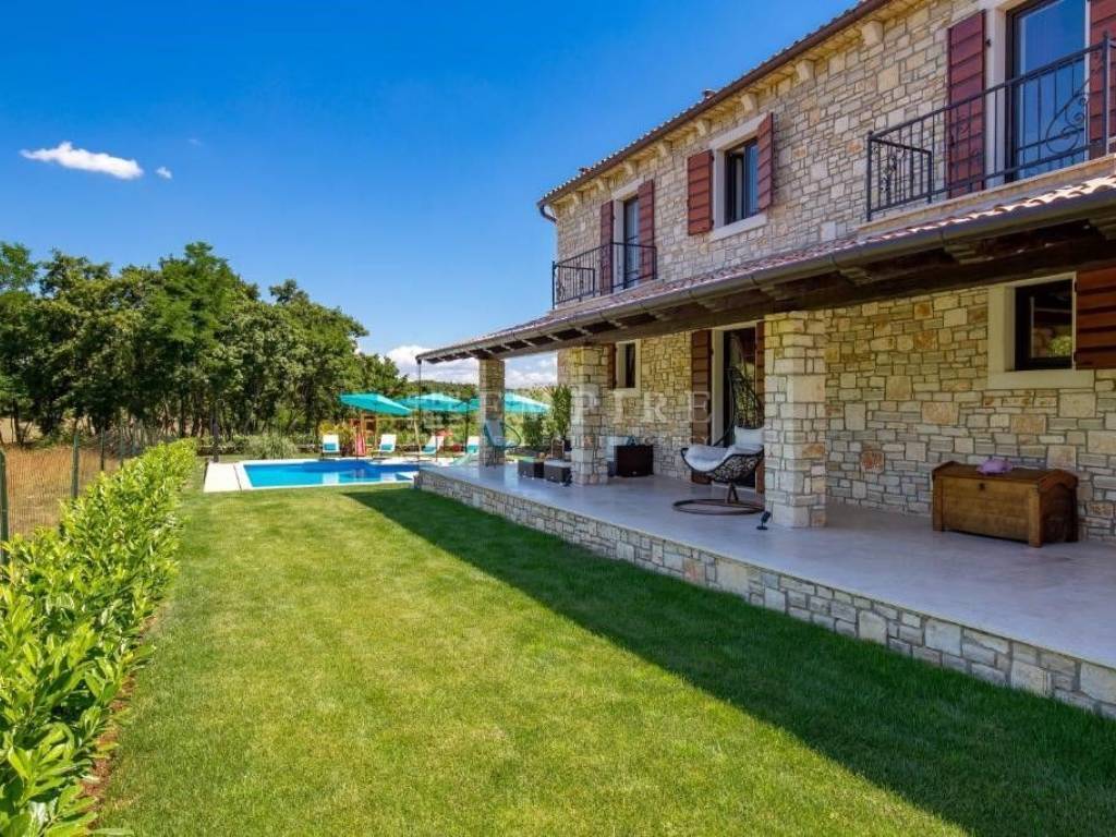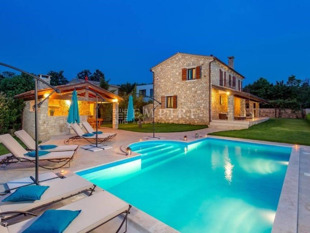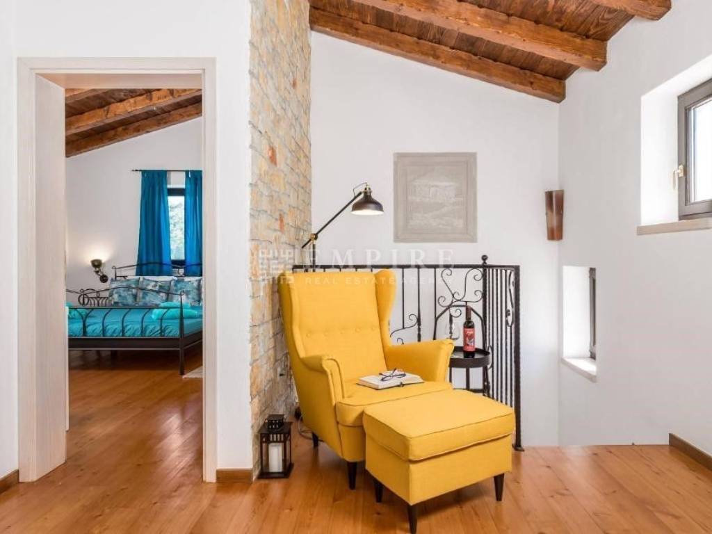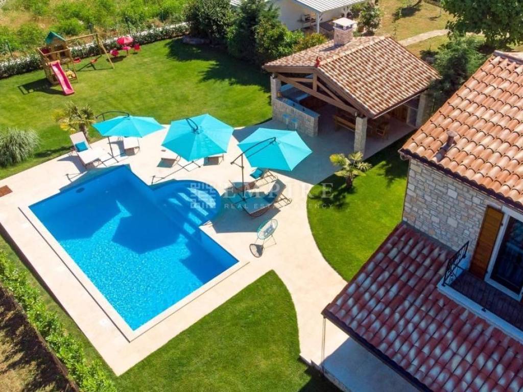 On a 1020 m² plot, this beautiful traditional villa offers 159 m² of living space. The ground floor features a fully equipped kitchen, dining room, comfortable living room, a fitness room with sauna and shower, bathroom, bedroom, and laundry. The first floor includes two spacious bedrooms and a bathroom with a jacuzzi. Heating and cooling are provided by air conditioning in each room, a pellet stove in the living area, and underfloor heating in all bathrooms, making it comfortable year-round. The spacious yard is fully fenced, with an alarm system installed. The irrigation system ensures lush greenery, and there is an outdoor kitchen with a large dining table, perfect for summer gatherings with a view of the pool and surrounding greenery. The 34 m² pool blends seamlessly with the property, offering privacy and tranquility. This high-quality property is located in central Istria, close to all necessary amenities. It is currently used for tourist rentals, generating excellent income for the owner year-round.